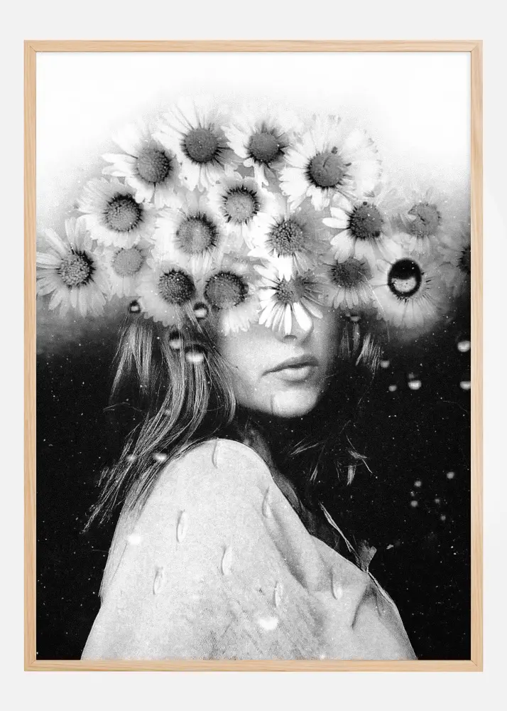 Ez a fekete-fehér poszter időtlen és költői képet rögzít egy nőről, akinek arca részben el van takarva egy dús margarétakoszorú által. Ez a művészi kompozíció a gondolatok és a kreativitás virágzását szimbolizálja, ahol a virágok a virágzó lelkiállapotot vagy talán a természet múlékony szépségét képviselik.