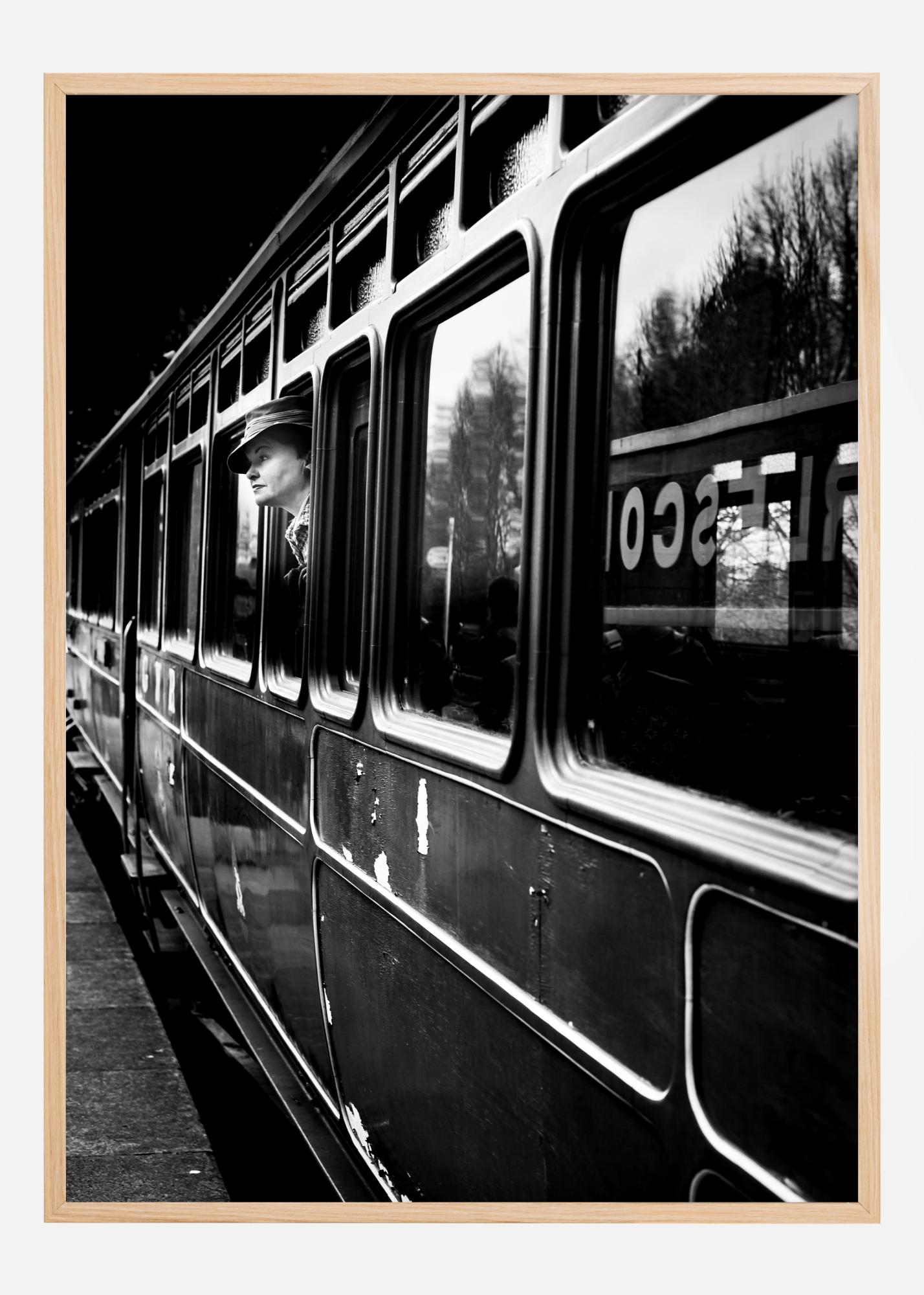 Ez a lenyűgöző fekete-fehér poszter egy nosztalgikus pillanatfelvételt örökít meg egy vonat ablakán kinéző személyről. A klasszikus kalapot viselő személy időtlen érzést kölcsönöz a képnek, miközben a tükröződések és kontrasztok drámai és érzelmi légkört teremtenek. A vonat tükörsima felülete és a sötét körvonalak a mozgás és a változás érzését keltik.