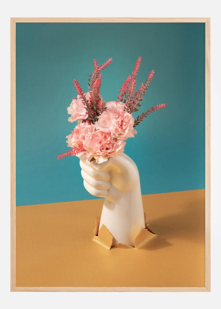 Ez a kreatív és találékony poszter egy szoborszerű kezet ábrázol, amely egy virágzó virágcsokrot tart, illúziót keltve egy vázáról. A háttér nyugodt kék árnyalatai gyönyörűen kontrasztálnak a meleg sárga és rózsaszín színekkel, friss és kortárs érzést teremtve. A megosztott kompozíció, amelyben a kéz áttör a sárga felületen, dinamikát és háromdimenziós illúziót ad a képhez.