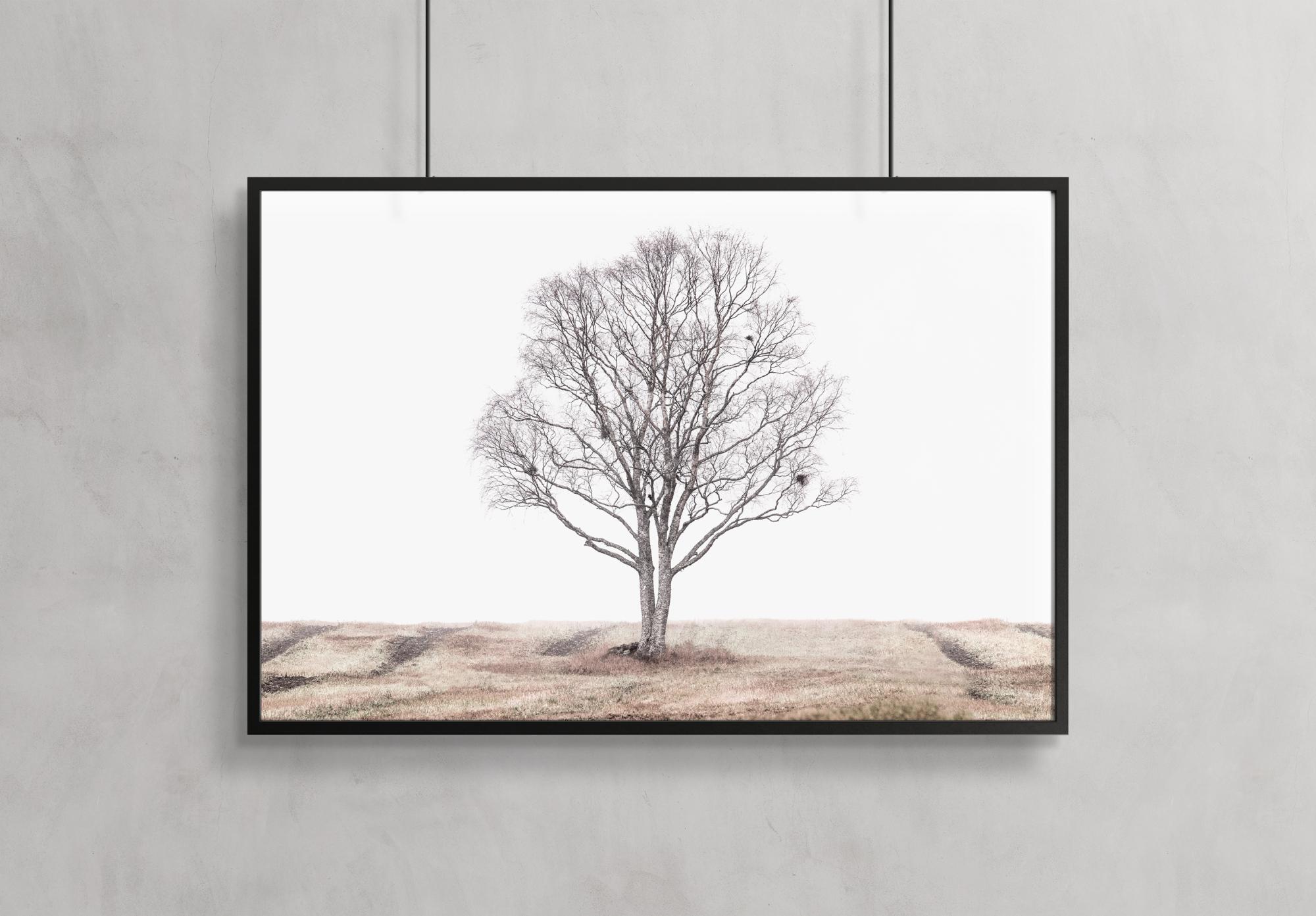 Egy erőteljes poszter egy magányos téli fáról. A csupasz fa egy havas mező közepén áll világos fehér háttérrel. Fenséges, de hideg időjárást is sugall. Vigyél be egy darabot a télből az otthonodba ezzel a meggyőző képpel, és világíts meg egy sötét falat.