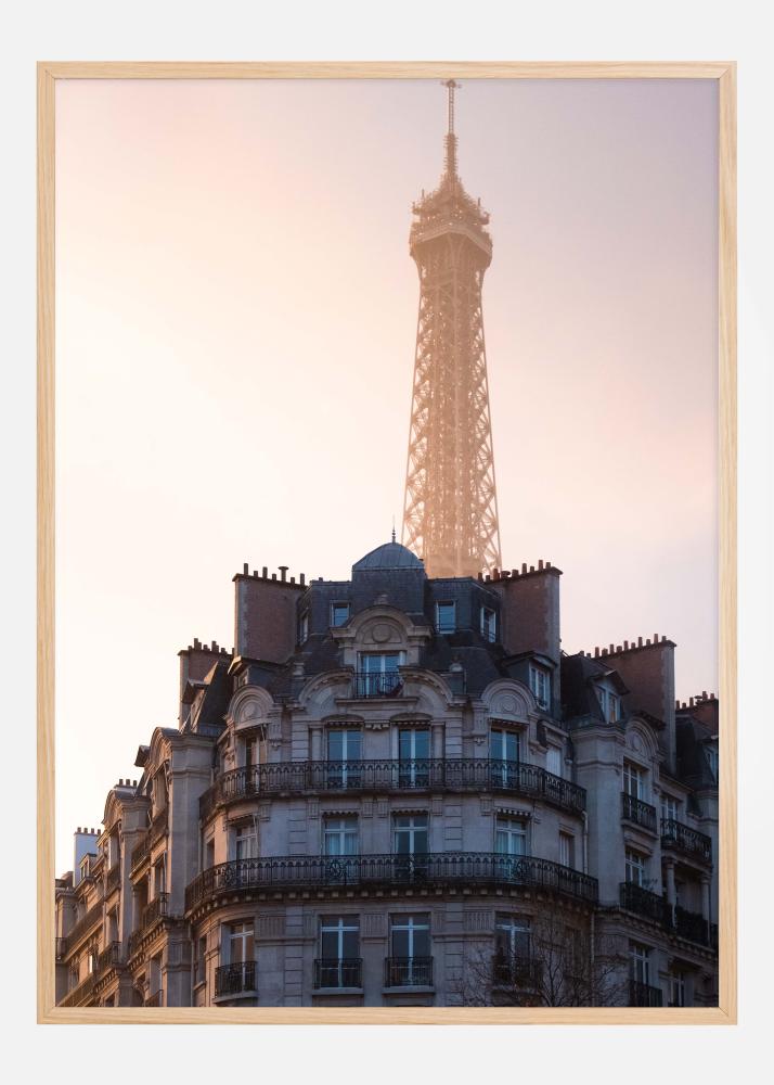 Ez a poszter megragadja Párizs lényegét az Eiffel-torony romantikus és elbűvölő ábrázolásával, amely félénken kibukkan a klasszikus haussmann-stílusú párizsi épületek mögül. A naplemente meleg tónusa lágy hátteret ad, ahol az ég pasztellszínei álomszerű nyugalmat sugároznak. Ennek a nyomtatásnak a természetes színei eleganciát és egyszerűséget visznek, tökéletes kiegészítővé téve azt minden helyiséghez, amely világkultúra finom érintését igényli.