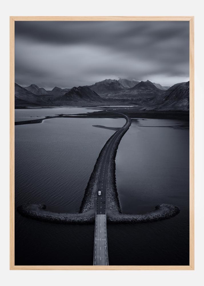 Egy poszter szürke tónusokban, egy széles úttal, amely tavakon keresztül halad, és a háttérben lévő hegyek közé megy. Egy szürke felhős égbolt terül el fölötte. Egyetlen fehér autó halad az úton a távolba. Kombináld világos falakkal, hogy egy kis színt vigyél ennek a szigorú képnek.