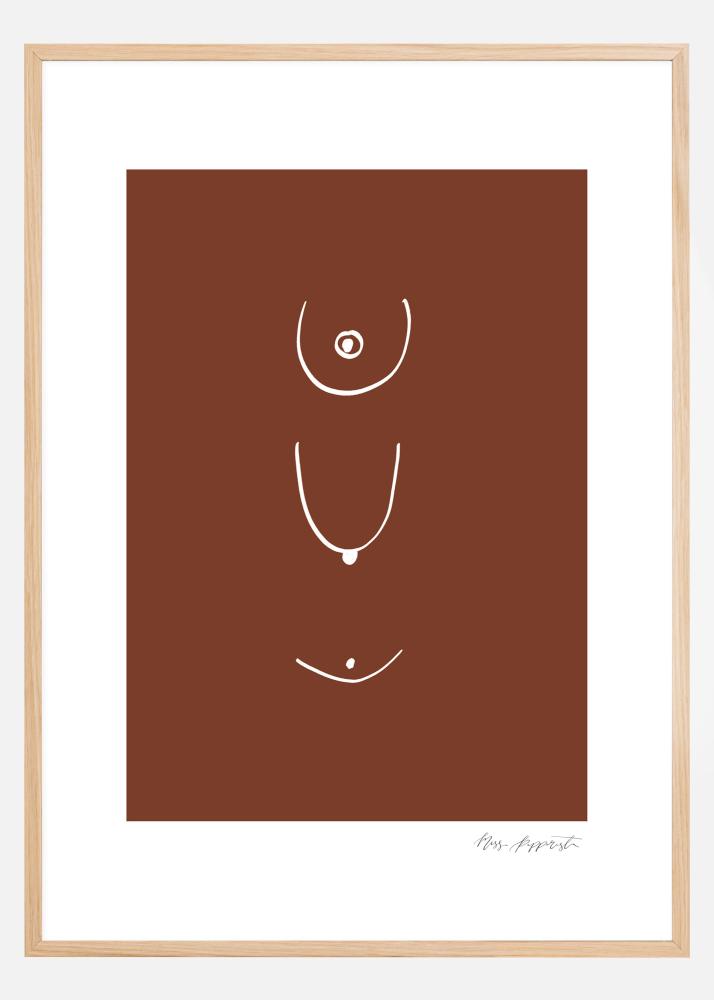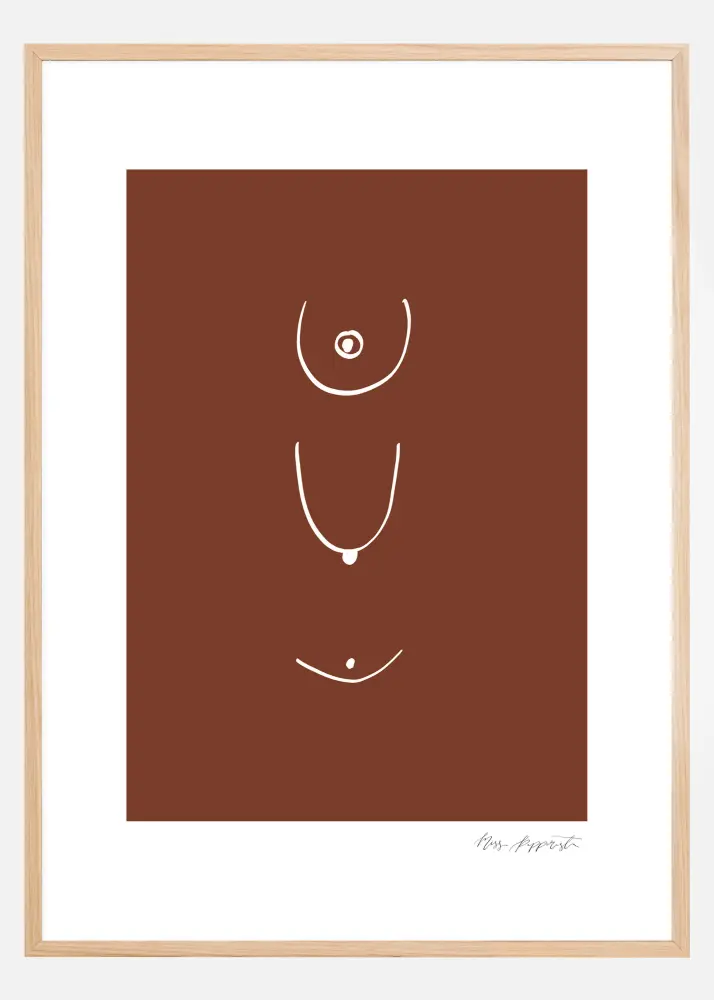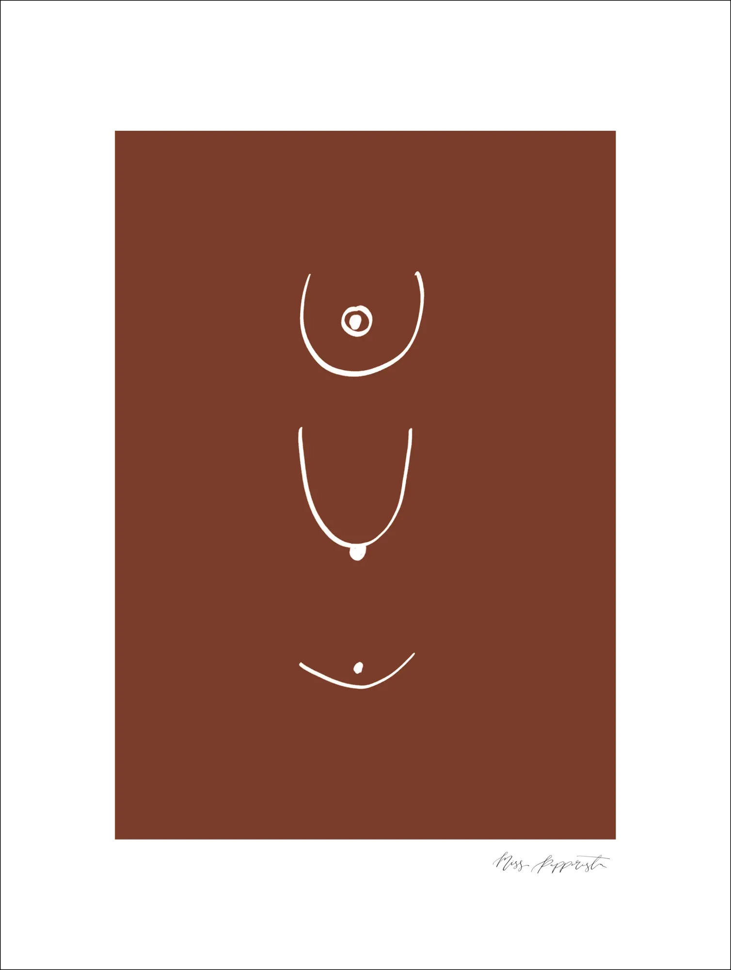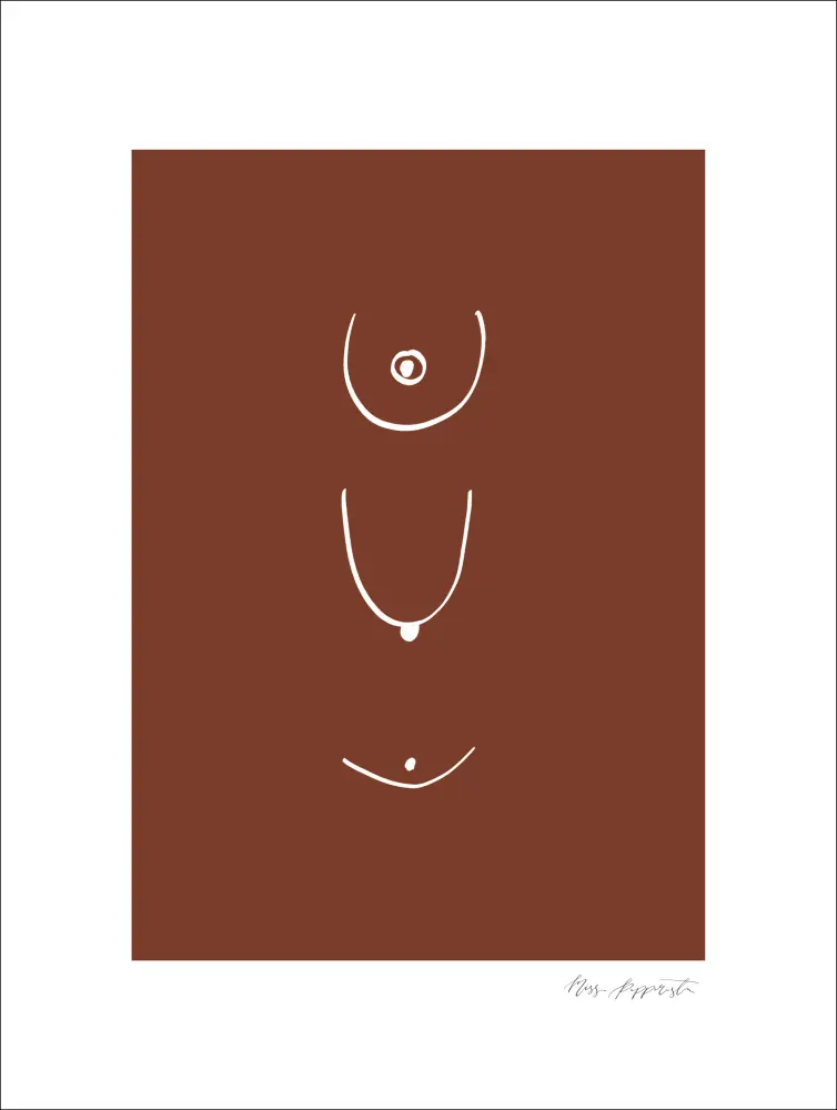 Egy absztrakt poszter fehér görbe vonalakkal és pöttyökkel egyszerű barna háttéren. A vonalakat úgy értelmezheted, ahogy szeretnéd, de úgy néznek ki, mint különböző szögből rajzolt női mellek. Élvezd ennek az egyszerű képnek a kissé furcsa jellegét.