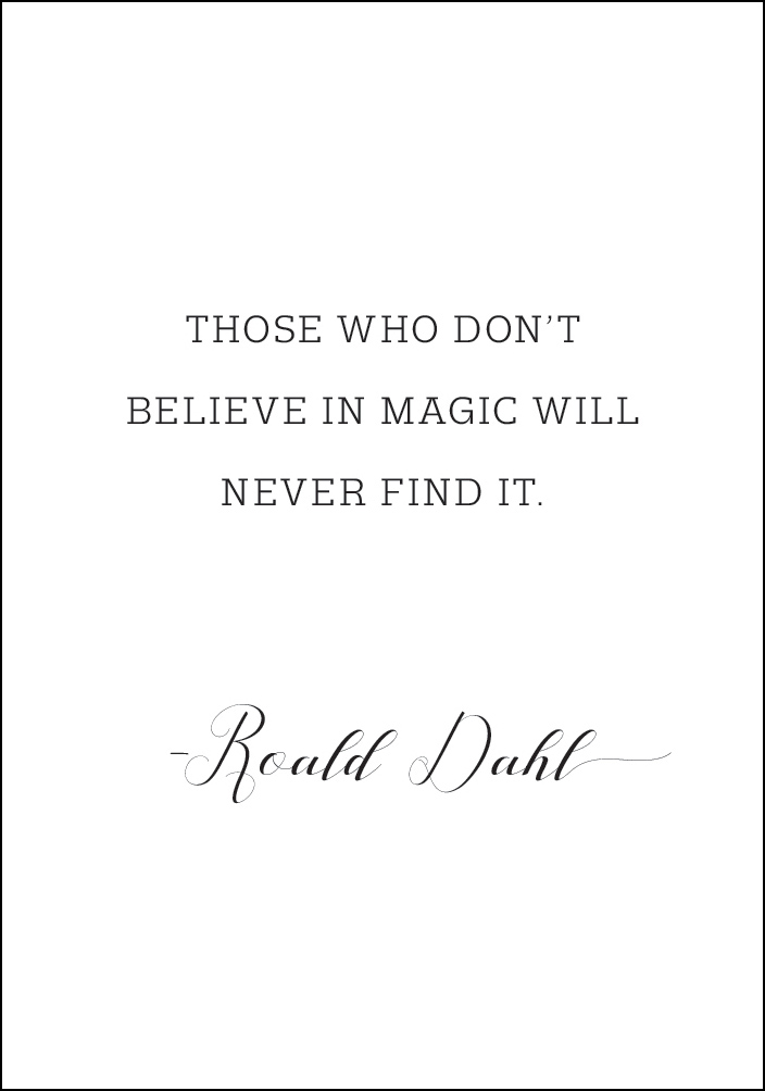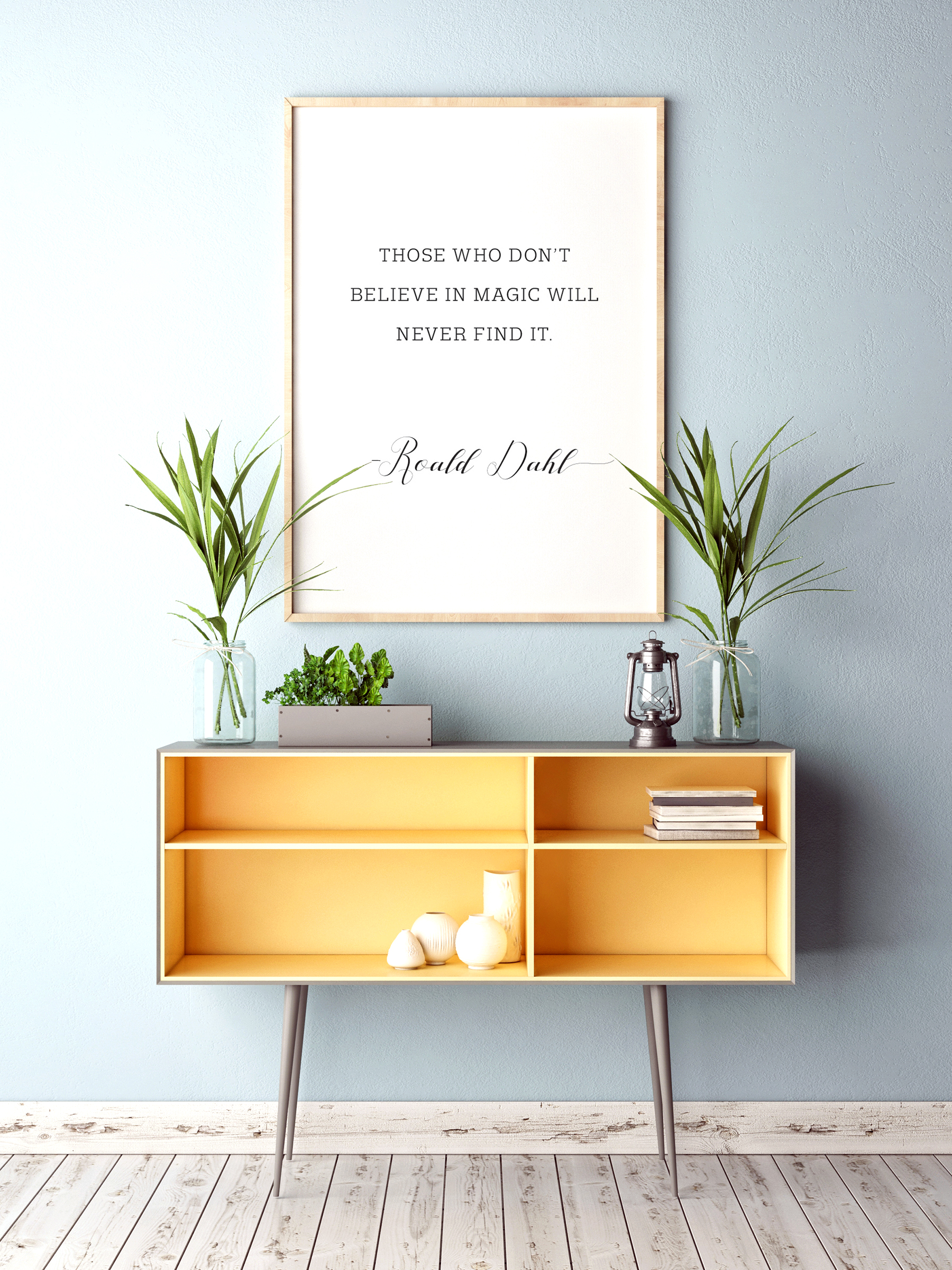 Egy szórakoztató inspirációs poszter Roald Dahl írótól származó híres idézettel. Az idézet "Those Who Don't Believe in Magic Will Never Find It" egy könnyen olvasható írógépírású betűtípussal van írva, a szerző neve alul dőlt stílussal. Az egyszerű fekete frázis kiemelkedik a fehér háttérből, emlékeztetve arra, hogy éljünk minden napért.