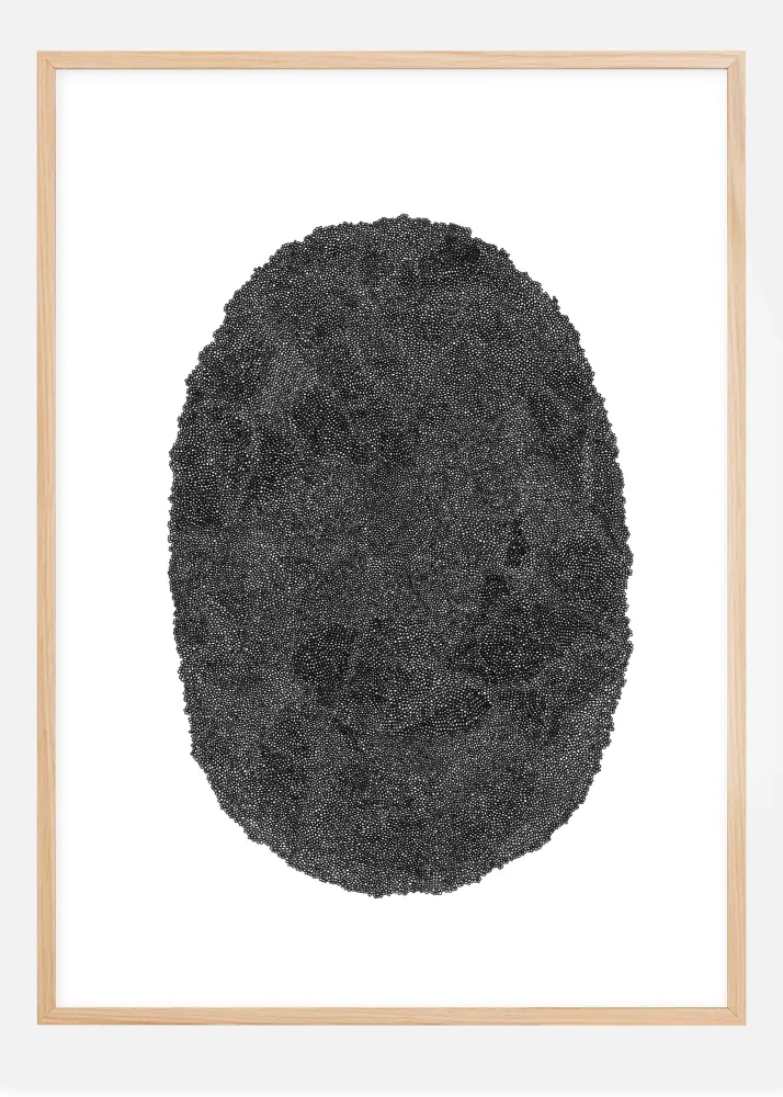 Egy grafikus művészeti poszter fekete tintával, amely egy ujjlenyomatot ábrázol, Belinda Hellberg, Hells Bells Sthlm alkotása. Egy elegáns és minimalista poszter, amely könnyen kombinálható más kedvencekkel egy nagyobb képfalon.