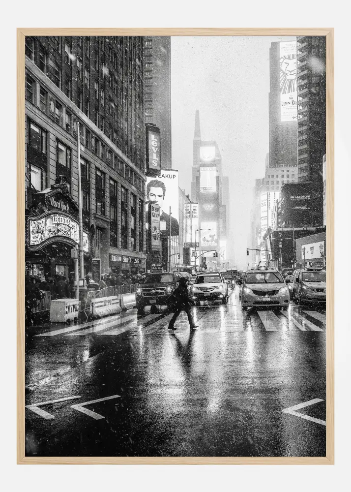 Egy városi poszter a New York-i Times Square-rel. Ezen a fekete-fehér képen egy személy kel át az utcán éjjel, az esőben. Az autók arra várnak, hogy továbbhaladhassanak. Világos reklámtáblák és felhőkarcolók láthatók a távolban, amikor az utca mentén nézel. Az atmoszféra kézzelfogható, szinte mintha ott lennél.