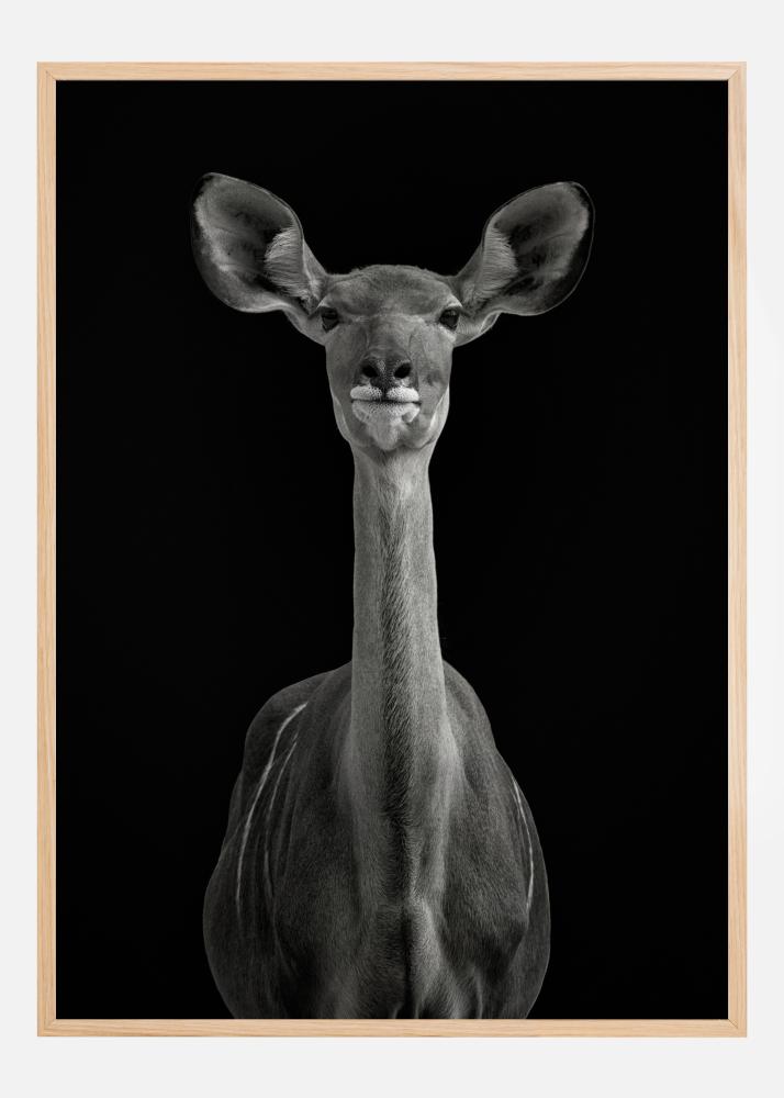 Egy fantasztikus portré egy antilopról, mély fekete háttér előtt. Az antilop a kamera felé fordul, fülei előrefeszülnek, miközben figyel és hallgat. Nyaka hosszú és karcsú, szemei lágyak. Kombináld egy másik állati nyomattal, hogy lenyűgöző zoológiai érzetet kelts.