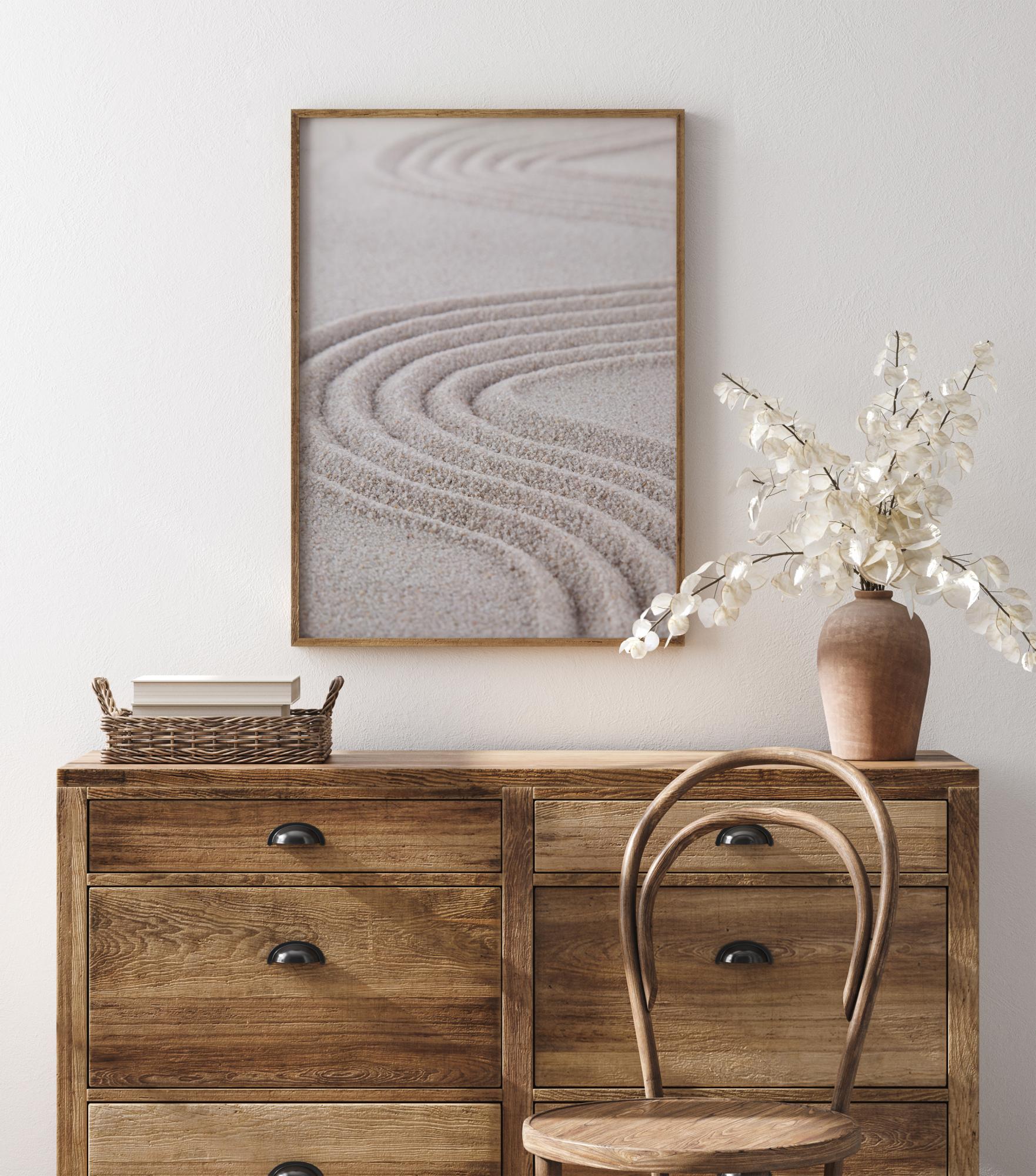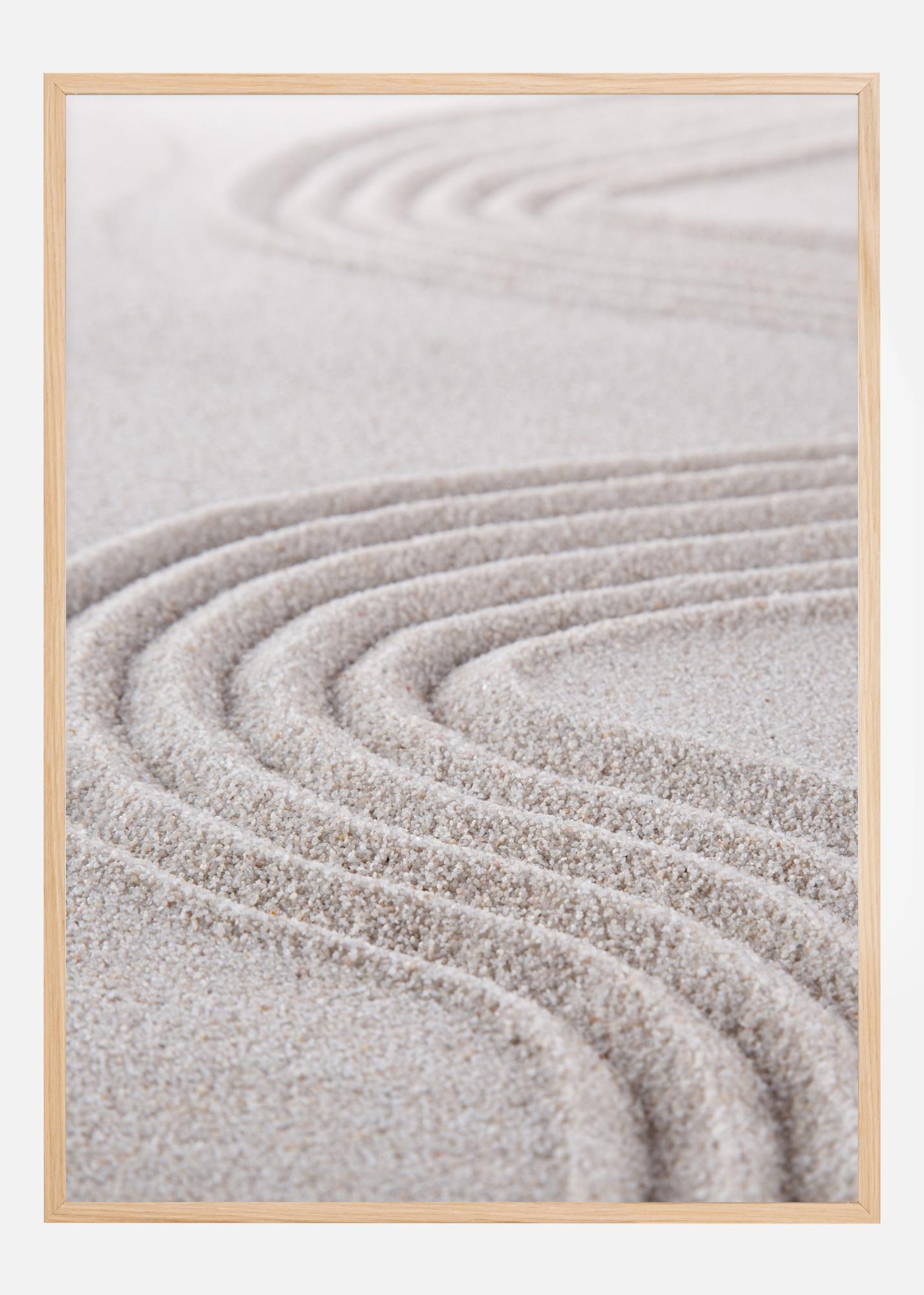 Egy közeli kép poszterhomokba rajzolt vonalakkal. Egy gereblyét használtak az örvények kialakításához a homokban, a vonalak egyenlő távolságra vannak egymástól, hogy mély hornyokat hozzanak létre. A közeli képnek köszönhetően látható a mókás örvénylő minta szemcséi. Kombinálja egy bézs fallal, hogy beépítse a homok színét a képbe.