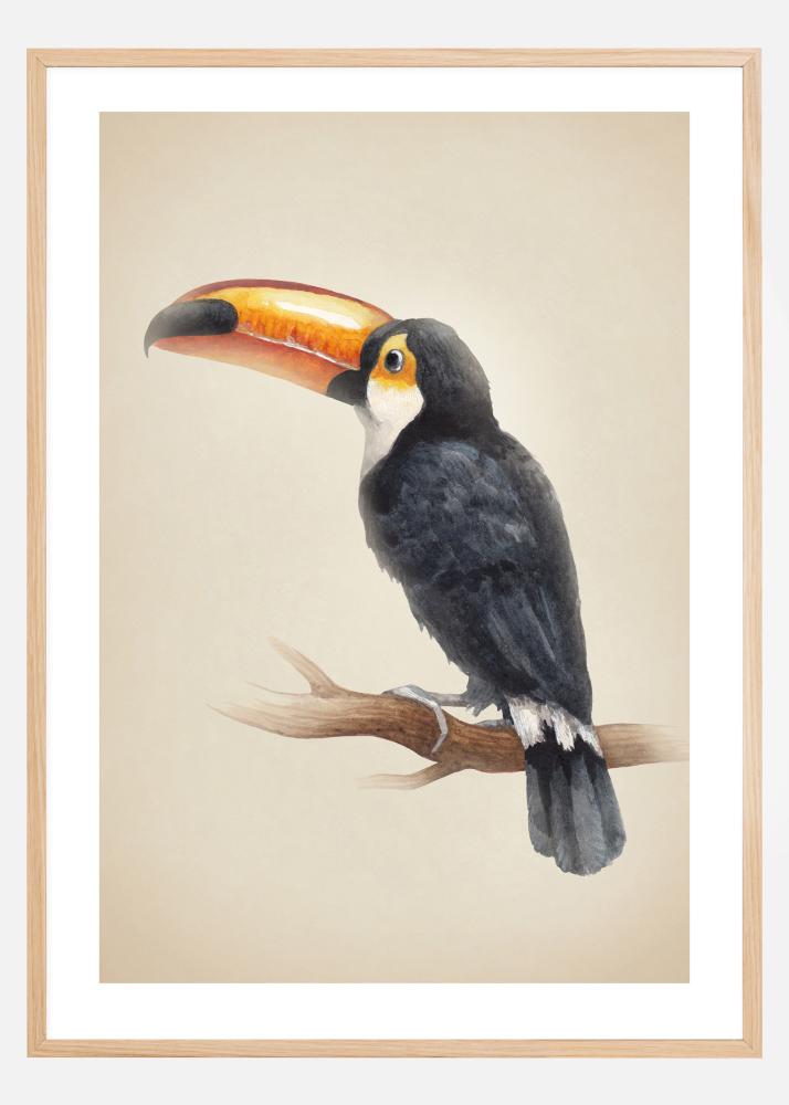 Egy aranyos portréposzter egy nagyszájú tukánnal. A madárról készült festményen a világossárga csőr kiemelkedik a szürke háttérből. Enyhén oldalt fordulva a madár fényes fekete tollakkal ragyog ezen az egyszerű képen. Párosítsd egy másik poszterrel, amely trópusi madarakat ábrázol, hogy tökéletes szettet alkoss.