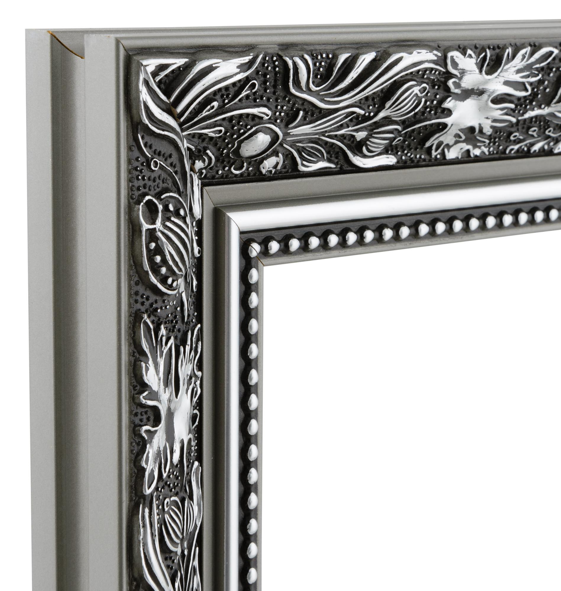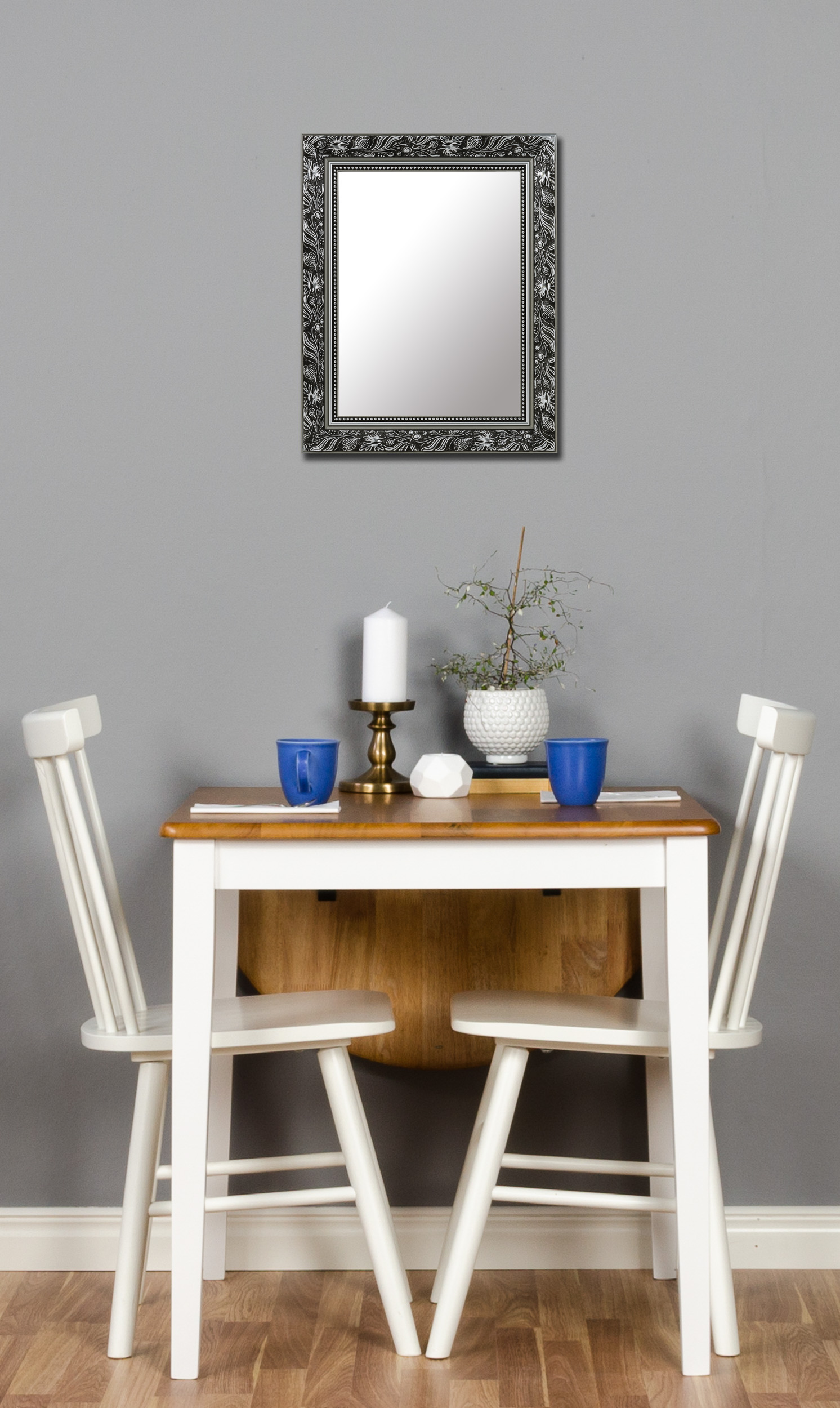 Tükrözd magad stílusosan ebben a szemrevaló tükörben, amely fekete és ezüst színekben pompázik! A tükör keretén matt és fényes részletek találhatók, ami rendkívül dekoratívvá teszi. Az elején található egy széles szakasz levélmintával, sima részek matt és fényes ezüstben, valamint egy gyöngymintás szalag közvetlenül az üveg mellett. Mivel a tükröt saját keretműhelyünk ügyes személyzete készíti, magas minőségű termékre számíthatsz!