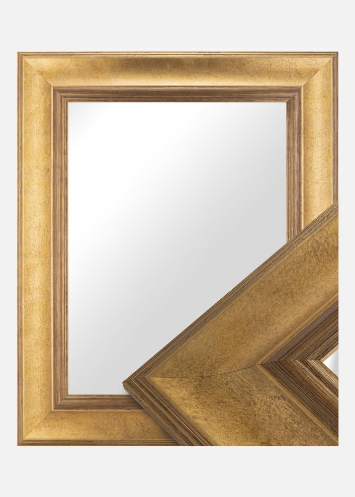 A keret fenyőből készült, és gyönyörű sötét arany tónussal rendelkezik, amely luxus és elegancia érzetét kelti. A kefélt felületen finom árnyalatok találhatók, amelyek enyhén patinás hatást keltenek, ami időtlen bájt kölcsönöz a tükörnek. A szélek mentén húzódó vékony vonalak hozzájárulnak a kifinomult részletgazdagsághoz, amely kiemeli a tükröt.