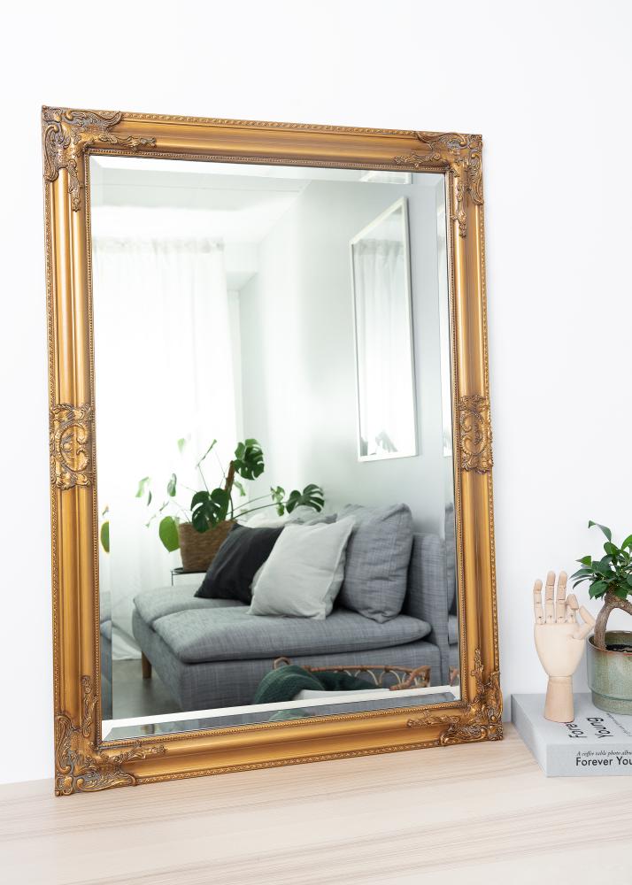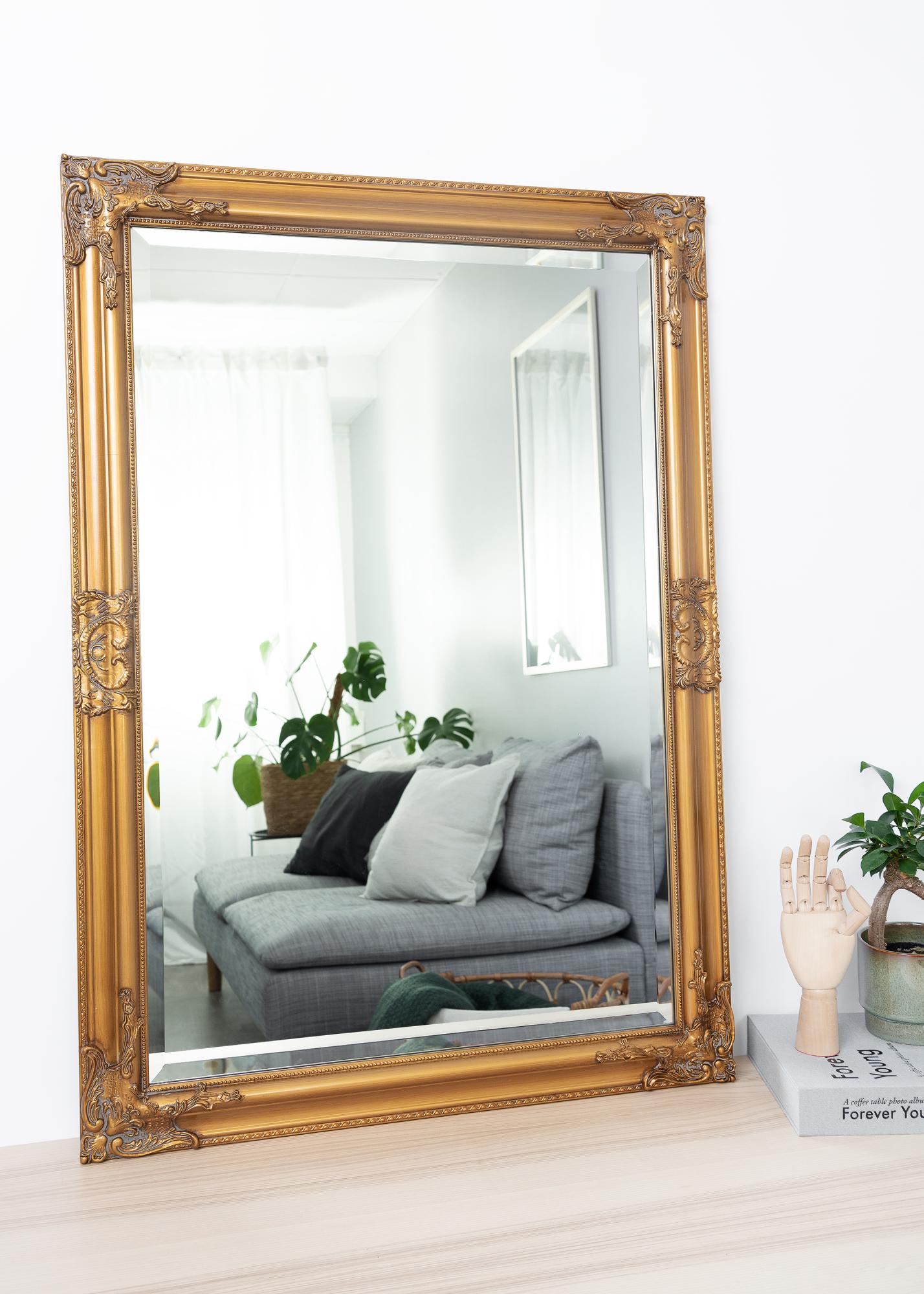 A Bologna Gold tükörsorozatnak latin kialakítása van, bőségesen dekorált sarkokkal és a keret oldalközepeinél. Kicsit keskenyebb keret, mint sok más hasonló stílusú tükör esetében. A keret fából készült, és a dekorációt gipszöntéssel készítették, mielőtt a keretre helyezték. Tökéletesen illik fürdőszobatükörként.