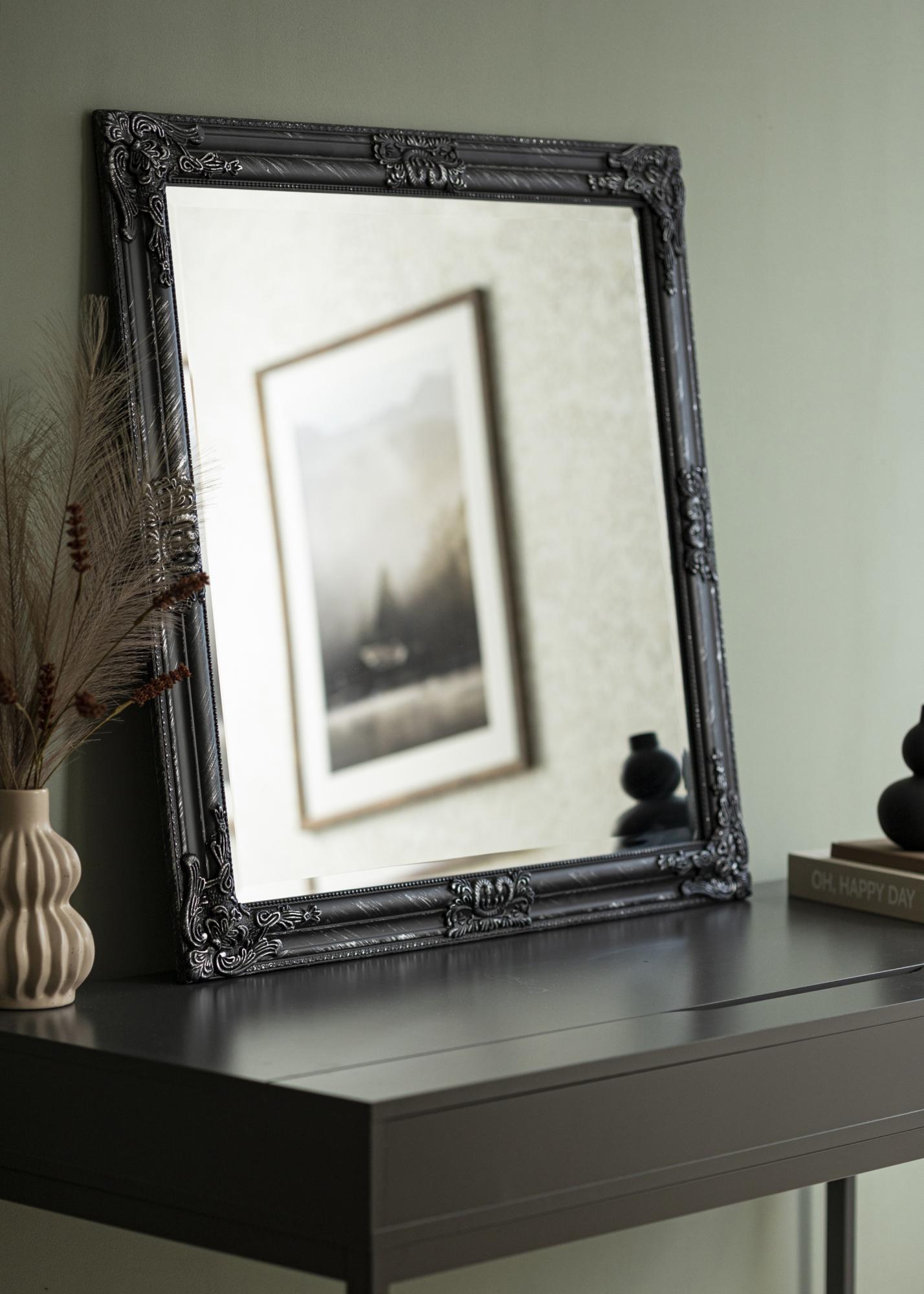 Ez a tükör egy négyzet alakban jelenik meg, amely szerkezetet és rendet teremt a helyiségben, egy sötét, részletes kerettel körülvéve, amely kifejezett és kifinomult stílust kölcsönöz. A fekete keretet finom részletek díszítik, amelyek a barokk pompás esztétikájára emlékeztetnek, ezáltal luxus és drámai hangulatot kölcsönözve a belső térnek.