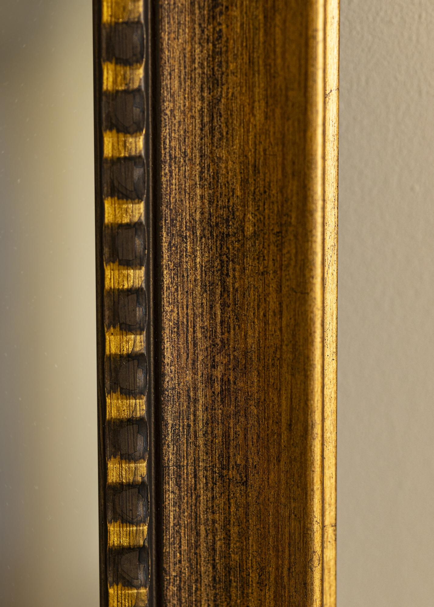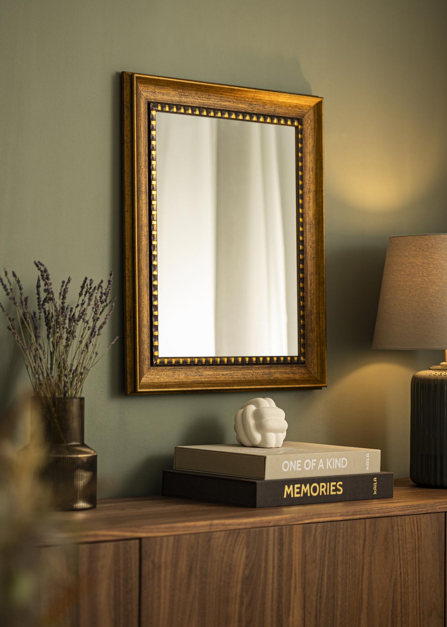 Ennek a tükörnek meleg barna színe van elegáns antik kivitelezéssel, amely időtlen bájt kölcsönöz a térnek. A széles profil finom fényt ad, és jellegzetes arany és fekete csíkos részlettel van díszítve a belső szélén. Ez szép kontrasztot hoz létre, és a tekintetet a tükör középpontjára vonzza.