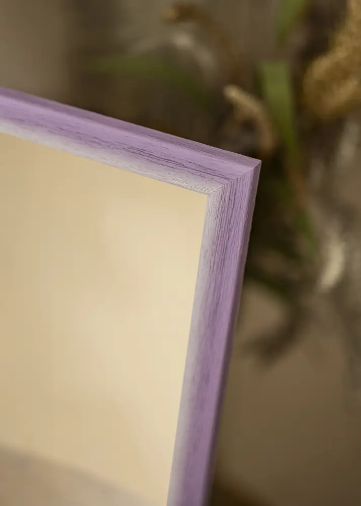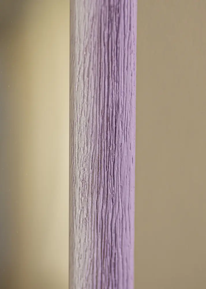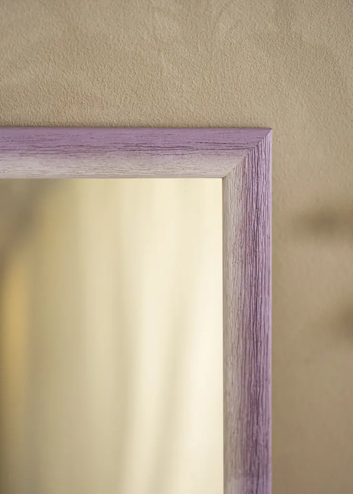 A tükör világoslila színe lágy átmenetet biztosít egy majdnem csontfehér árnyalattól egy enyhén levendulalila tónusig. Ez harmonikus és nyugodt érzetet kölcsönöz a tükörnek, ideálissá téve otthona pihentető hangulatának megteremtéséhez. A kiemelkedő faszerkezet függőleges erezete természetes és rusztikus érzetet ad, így a tükör jól beleolvad mind a modern, mind a hagyományos belső terekbe.