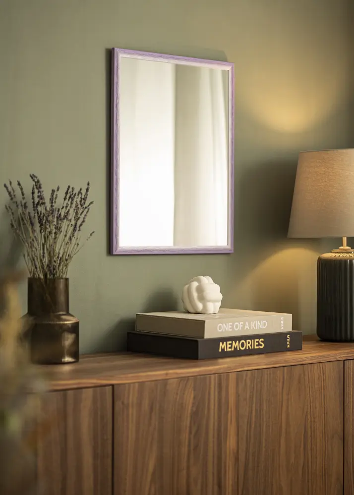 A Cornwall világoslila tükör egy elegáns és letisztult tükör, amelyet nagy gondossággal készítünk. Ez a tükör tökéletes választás azoknak, akik valami egyedi és személyes dolgot szeretnének, mivel a tükör a kívánt méretre szabható az Ön specifikus igényei szerint. A 23 mm széles ayosfa keret finom, de mégis jellegzetes keretezést nyújt, amely a legtöbb környezetbe illik.