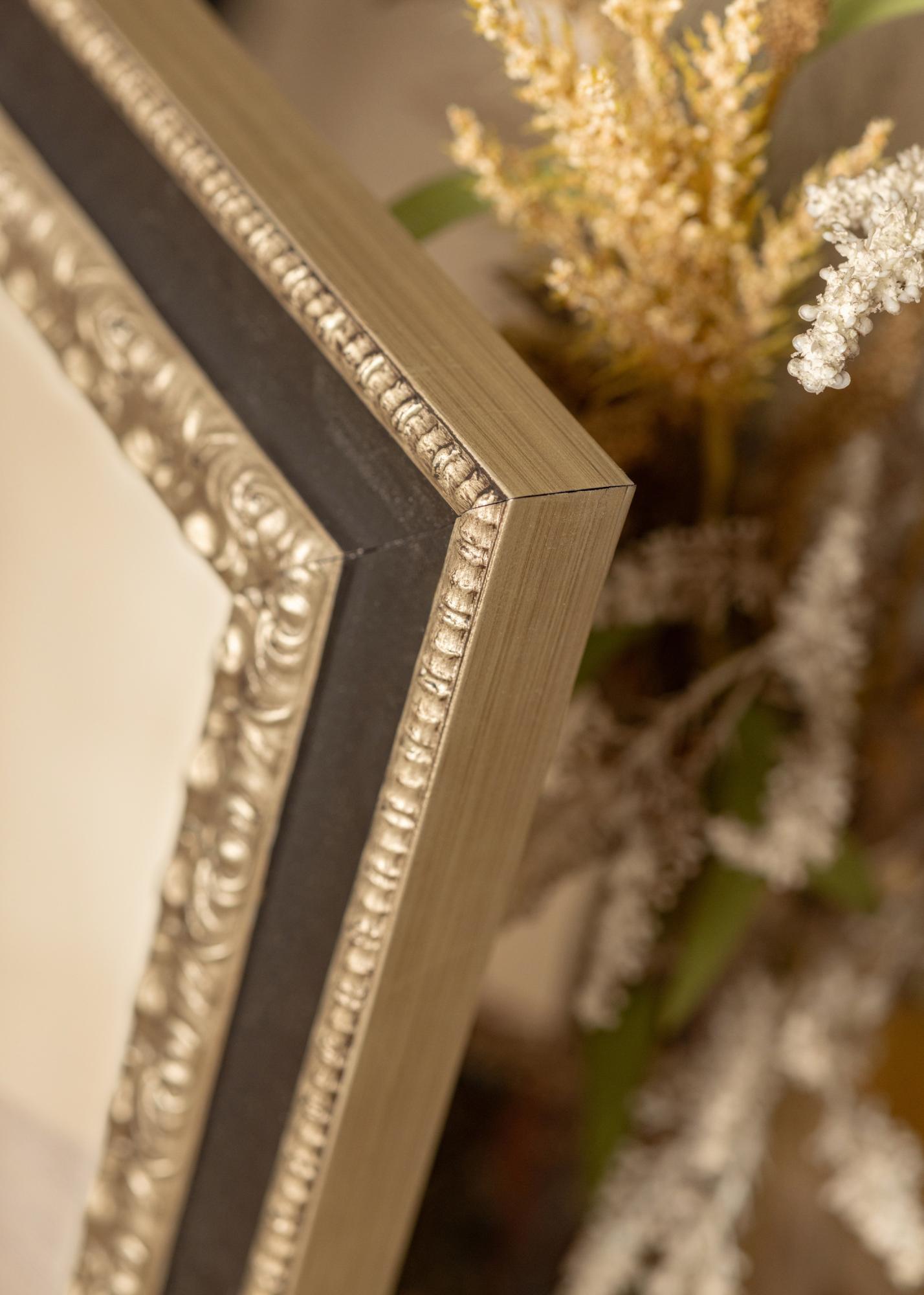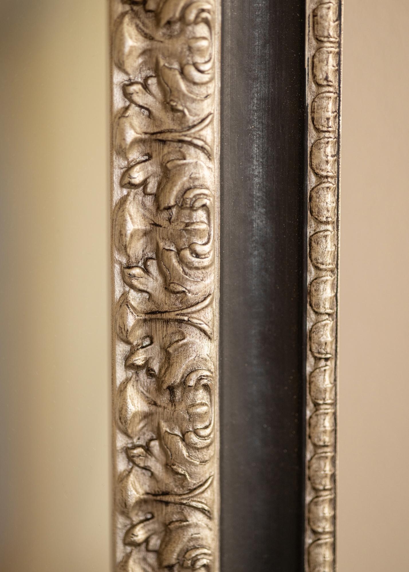 "Drottningholm Ezüst" egy gyönyörű, retro stílusú tükör Olaszországból, ujjas csapolt fenyőből, kézzel festve. A tükör gazdagon díszített ezüst profillal és széles fekete peremmel rendelkezik, amely elegáns megjelenést kölcsönöz a keretnek.