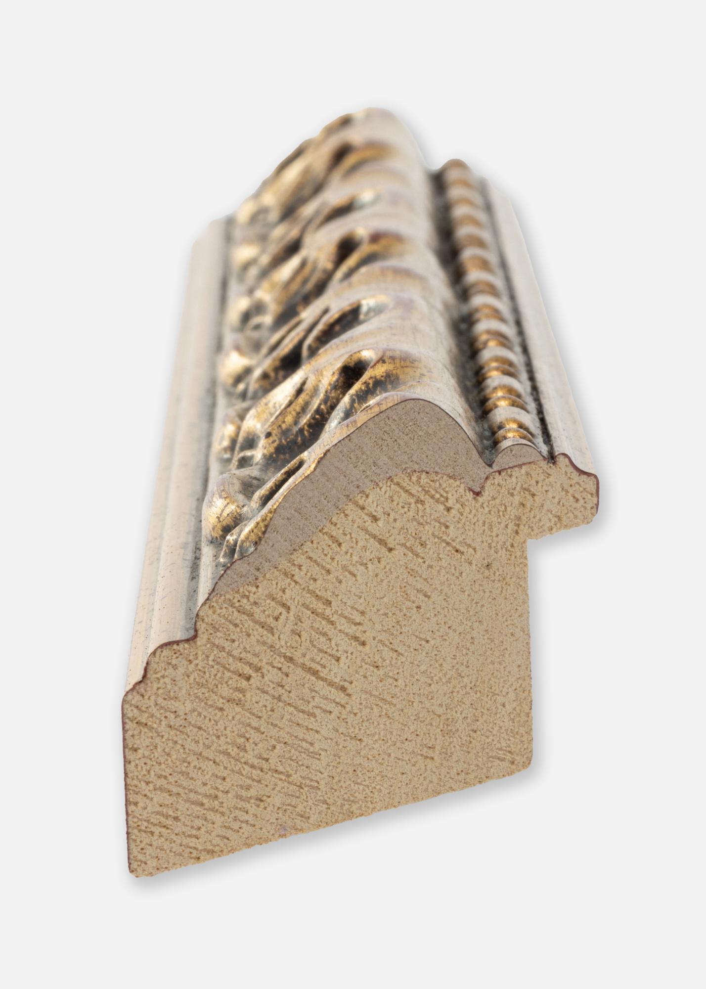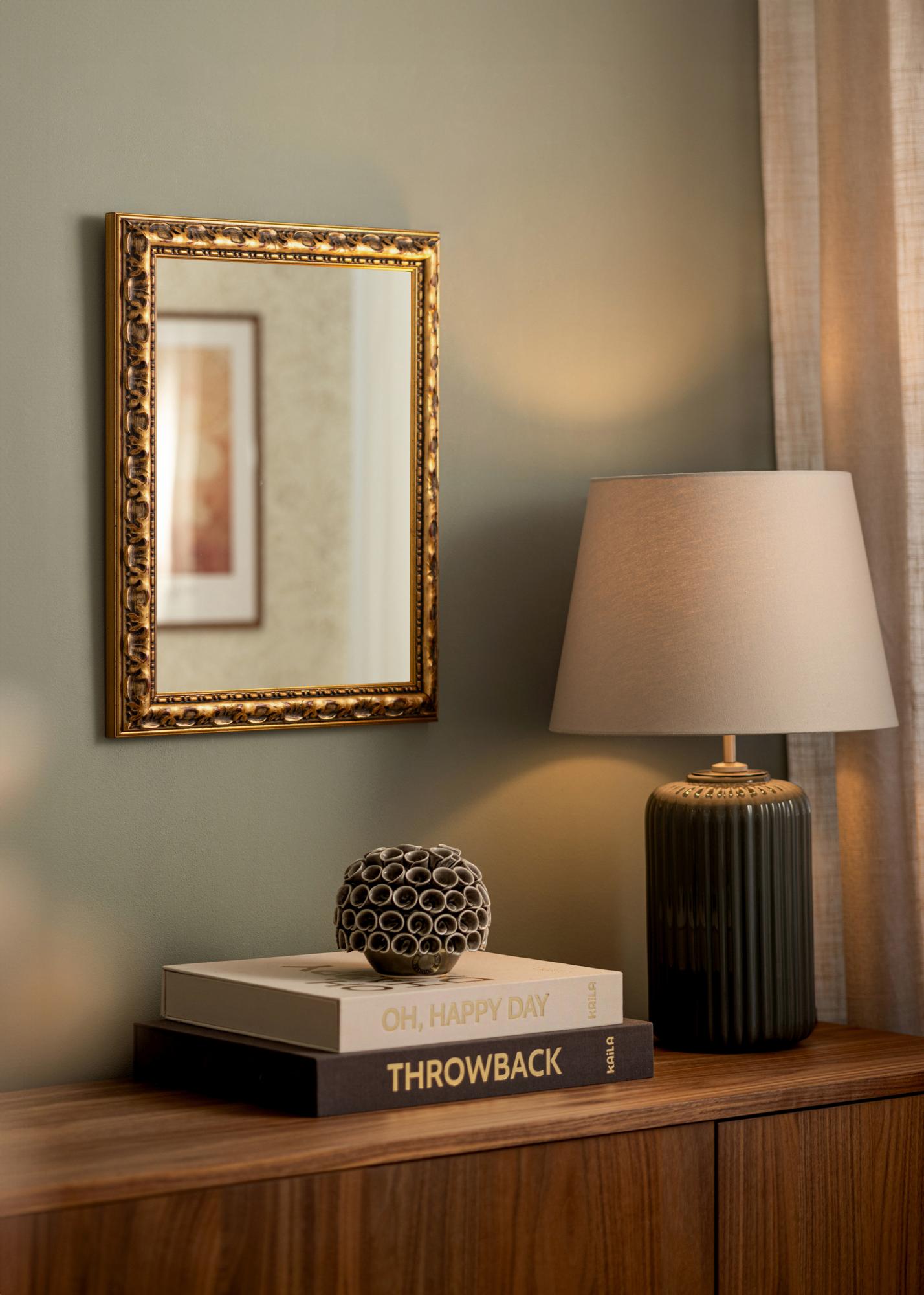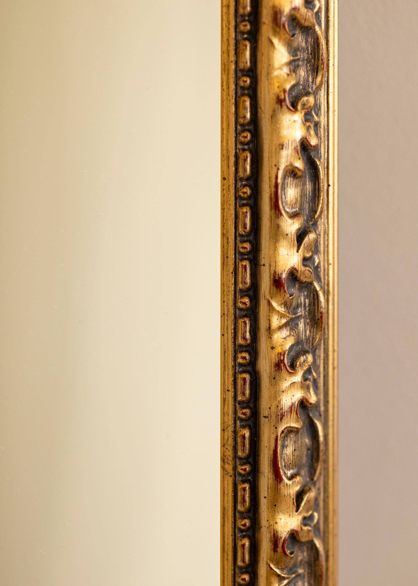 A Freyja Arany Tükör kerete 38 mm széles és 34 mm mély, amely robusztus és masszív érzést kölcsönöz a tükörnek. Fenyőből készült, kombinálva a tartósságot a klasszikus esztétikával. Az antik kivitelezés, sötét patinázott részletekkel és finom vörös beütésekkel erősíti a tükör rusztikus jellegét, és időtlen bájt kölcsönöz neki.