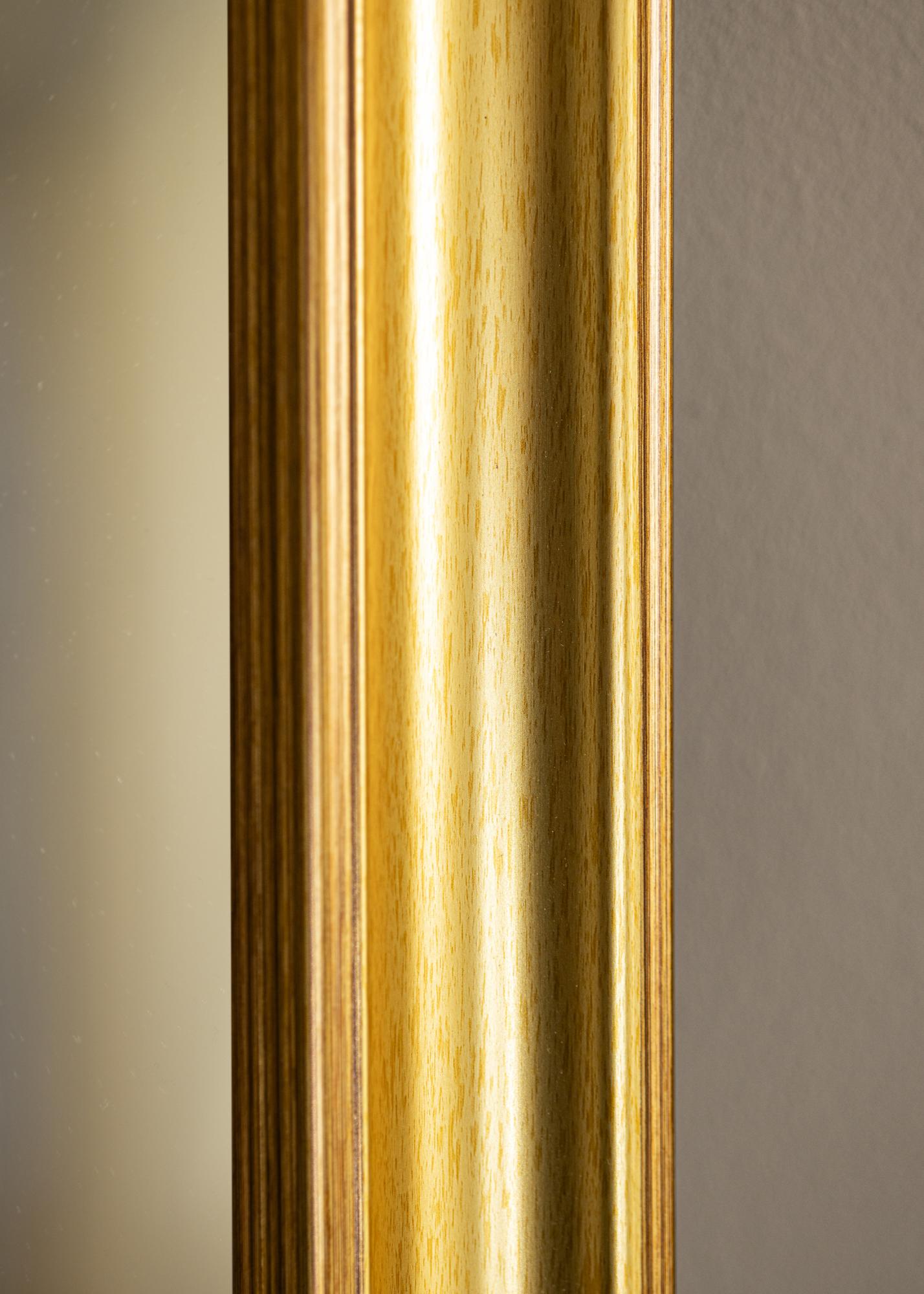 A keret kompozit anyagból készült, ami tartóssá és könnyűvé teszi. A profil jellegzetes dőlésszöggel rendelkezik, amely fokozza a fényvisszaverődéseket, ezáltal világos és hívogató légkört teremt a helyiségben. A felület meleg, kefe arany bevonattal és finom fa struktúrával rendelkezik, ami exkluzív érzést kölcsönöz a tükörnek anélkül, hogy túlságosan dominánssá válna.