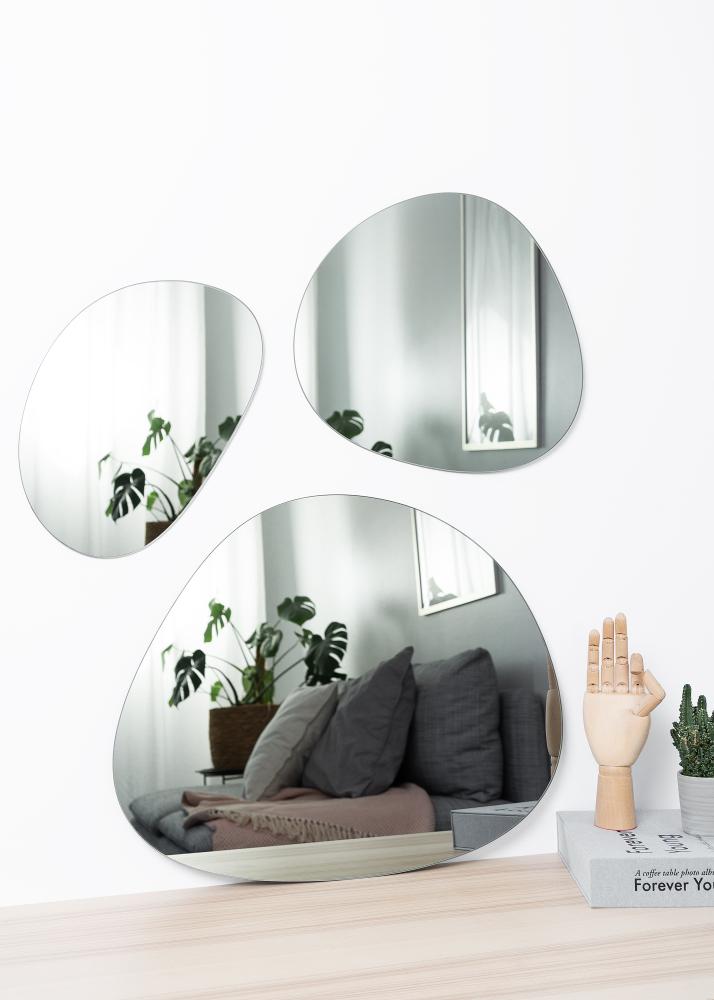 Ez a tükörszett a dán Incado-tól származik, ami azt jelenti, hogy a tükrök magas minőségűek és magas trendfaktorral rendelkeznek. Az, hogy melegszürke árnyalatú tónusú tükörüvegből készültek, különösen ízlésessé teszi őket, és a különböző méretek vidám kialakítást kölcsönöznek.