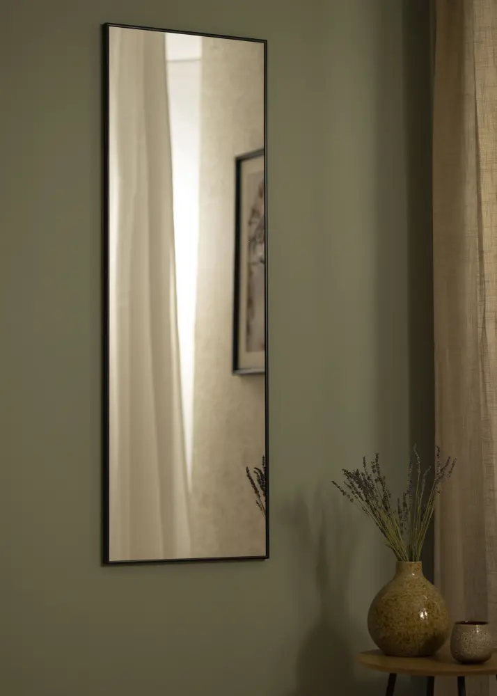 Álló irányának köszönhetően a tükör kiválóan illeszkedik keskeny helyiségekbe vagy egész alakos tükörként a hálószobában vagy az előszobában. A fekete keret kiegészíti a különböző belsőépítészeti stílusokat és színvilágokat, így sokoldalú lakberendezési elemmé válik. A tükör nemcsak szép részlet, hanem praktikus eszköz is világosság és tér érzésének megteremtéséhez otthonában.