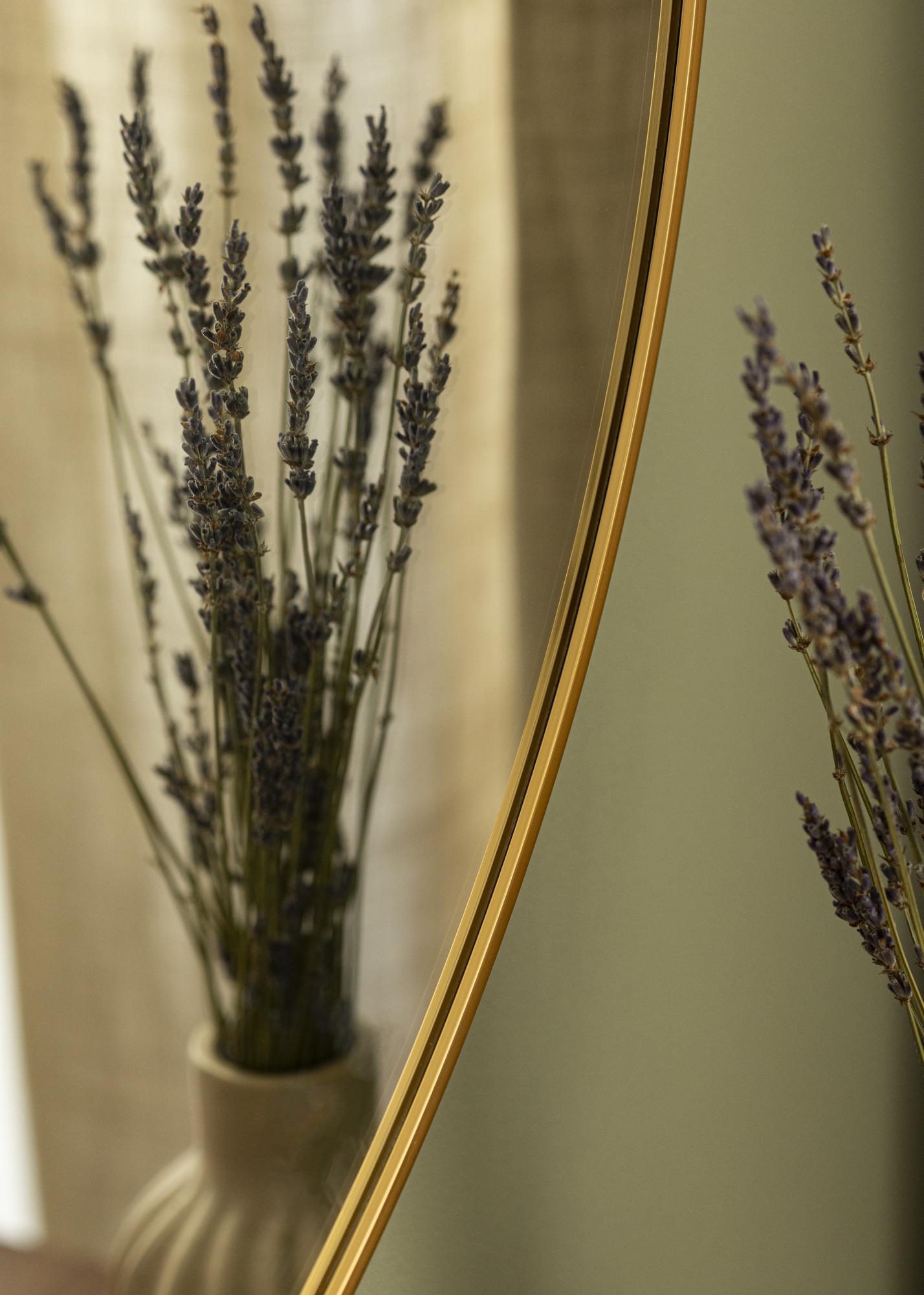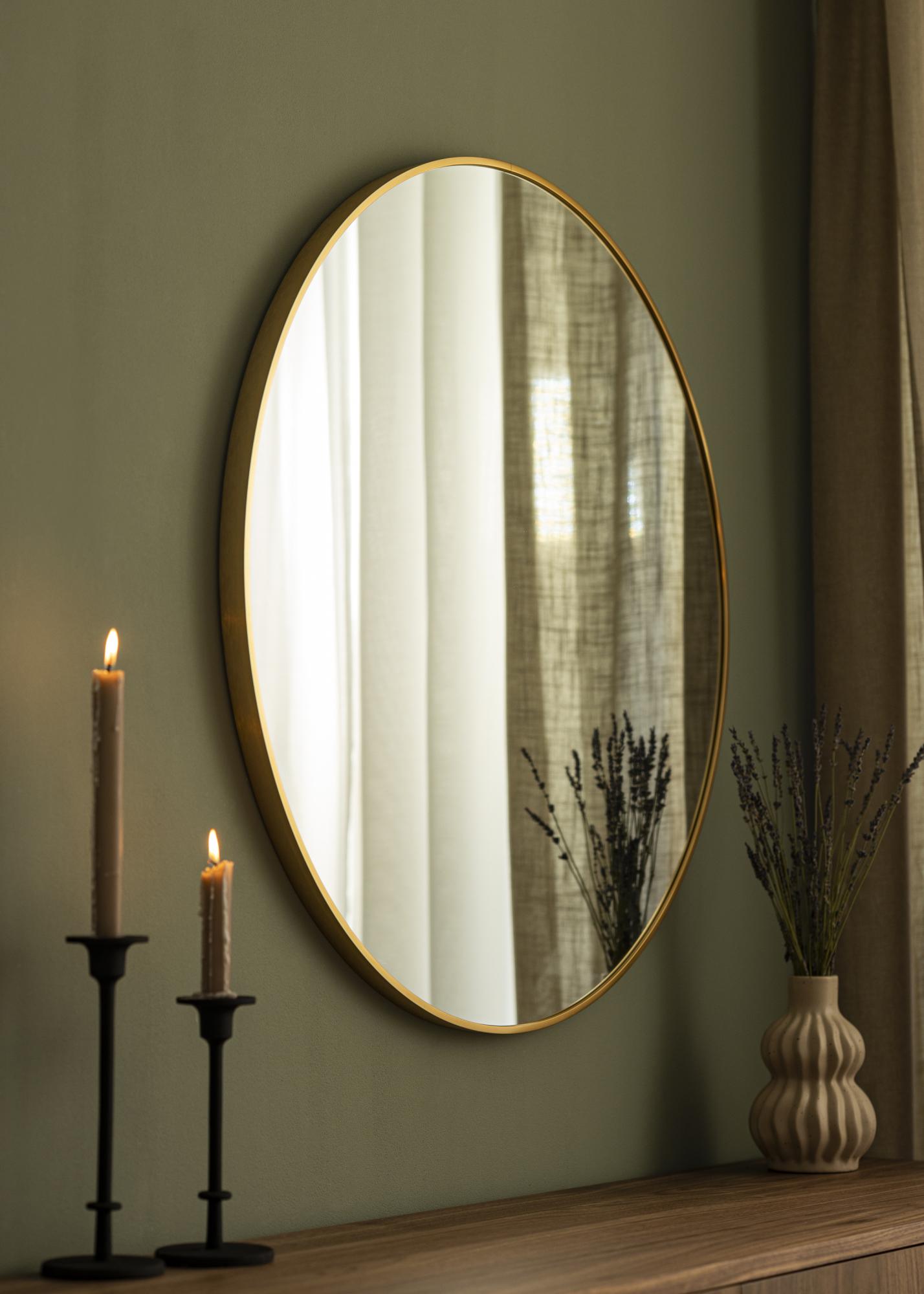 Ez a falra szerelhető tükör klasszikus kerek formával rendelkezik, amelyet elegáns arany színű alumínium keret vesz körül. A keret színe és fénye luxus atmoszférát teremt, és feltűnő részletet ad bármely falnak. A kerek forma lágy és harmonikus érzést kölcsönöz a szobának.