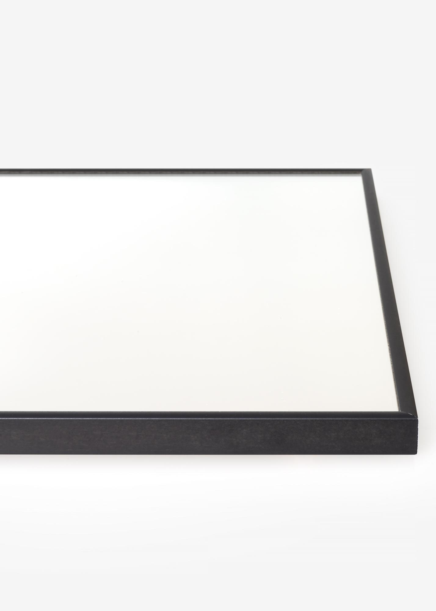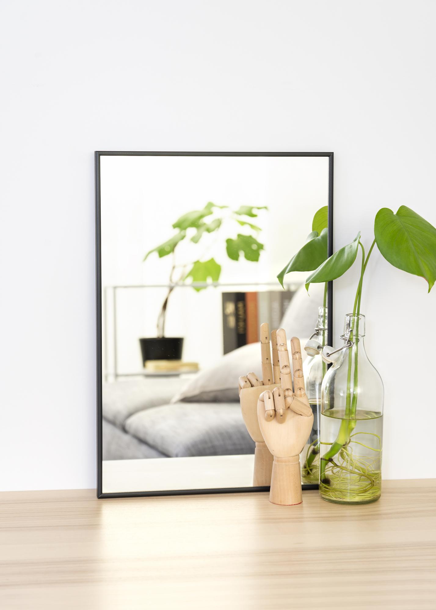 Egy elegáns tükör fekete alumínium kerettel. A tükör okos fali tartókkal van felszerelve, ami megkönnyíti a felakasztását.