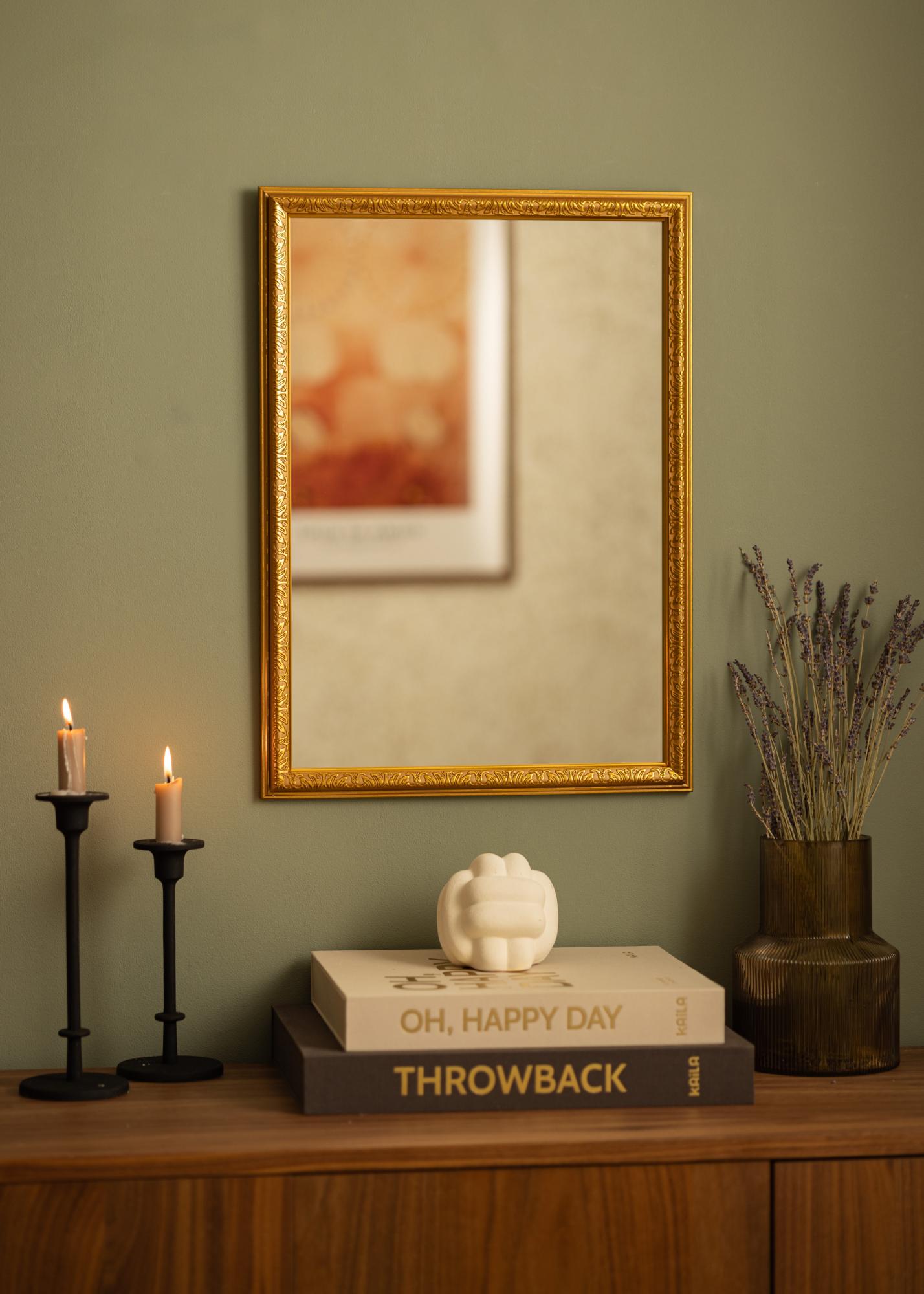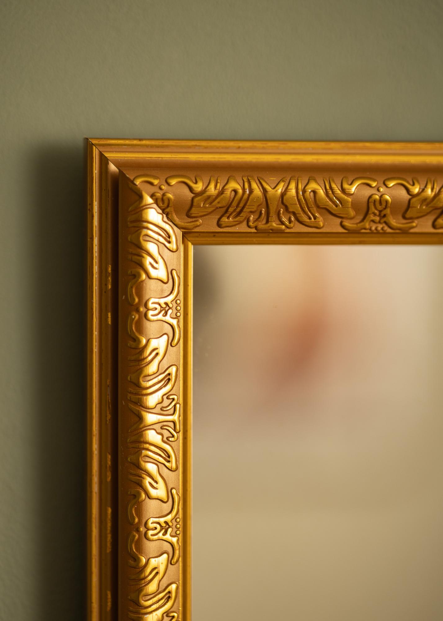 Ha luxus aranyszínű tükröt keresel, most abbahagyhatod a keresést. A Nostalgia Arany egy falitükör, 2,8 cm széles kerettel, elegáns profillal és egy gyönyörű dekoratív mintával. A tükörüveg visszaveri a fényt a szobádban, miközben maga a tükör is egy stílusos részlet lesz a faladon. A hátoldalon van egy fali rögzítő az egyszerűbb felakasztás érdekében.