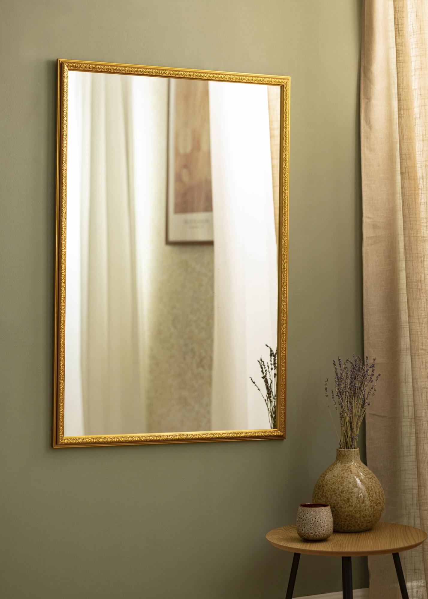 Ha egy luxus, aranyszínű tükröt keresel, most megállhatsz a kereséssel. Nostalgia Gold egy falitükör 2,8 cm széles kerettel, elegáns profillal és gyönyörű dekoratív mintával. A tükörüveg visszaveri a fényt a szobádban, miközben maga a tükör stílusos részletként jelenik meg a falon. A hátoldalon van fali rögzítő a könnyebb felakasztás érdekében.