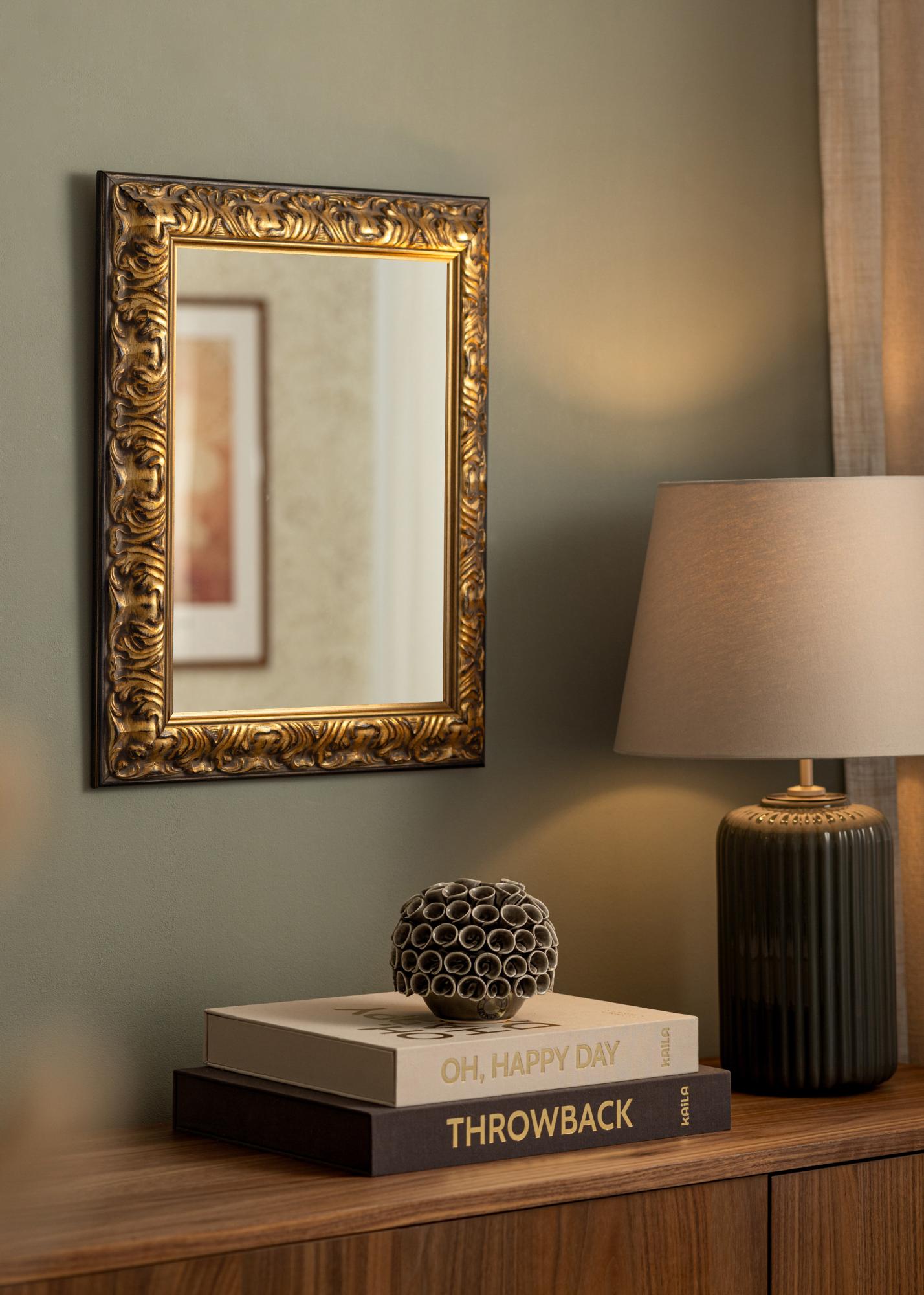 Az Odin Arany/Fekete Tükör kerete 64 mm széles és 38,5 mm mély, ami robusztus és masszív érzést kölcsönöz a tükörnek. Fenyőből készült, így ez a tükör tartós és stílusos. A széles keret úgy keretezi be a tükröt, hogy az a berendezés központi részévé válik, függetlenül attól, hogy az előszobában, a nappaliban vagy a hálószobában helyezkedik el.