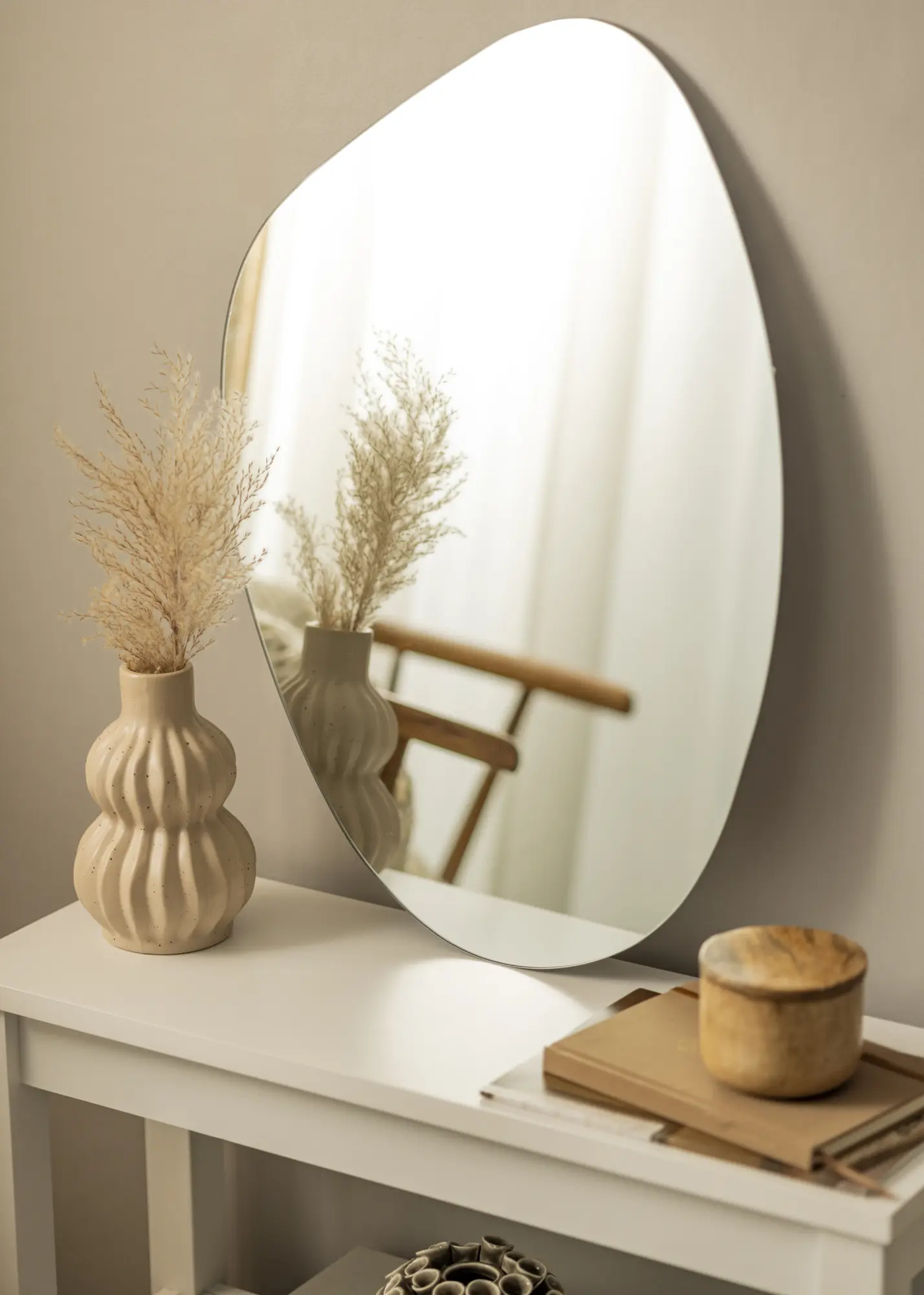 Ez a tükör minimalista kifejezéssel bír, keret nélküli kialakítással és vékony tükörüveggel. Mérete 50x60 cm, és egyszerűen felszerelhető a falra, a tükör hátulján található fali rögzítőnek köszönhetően.