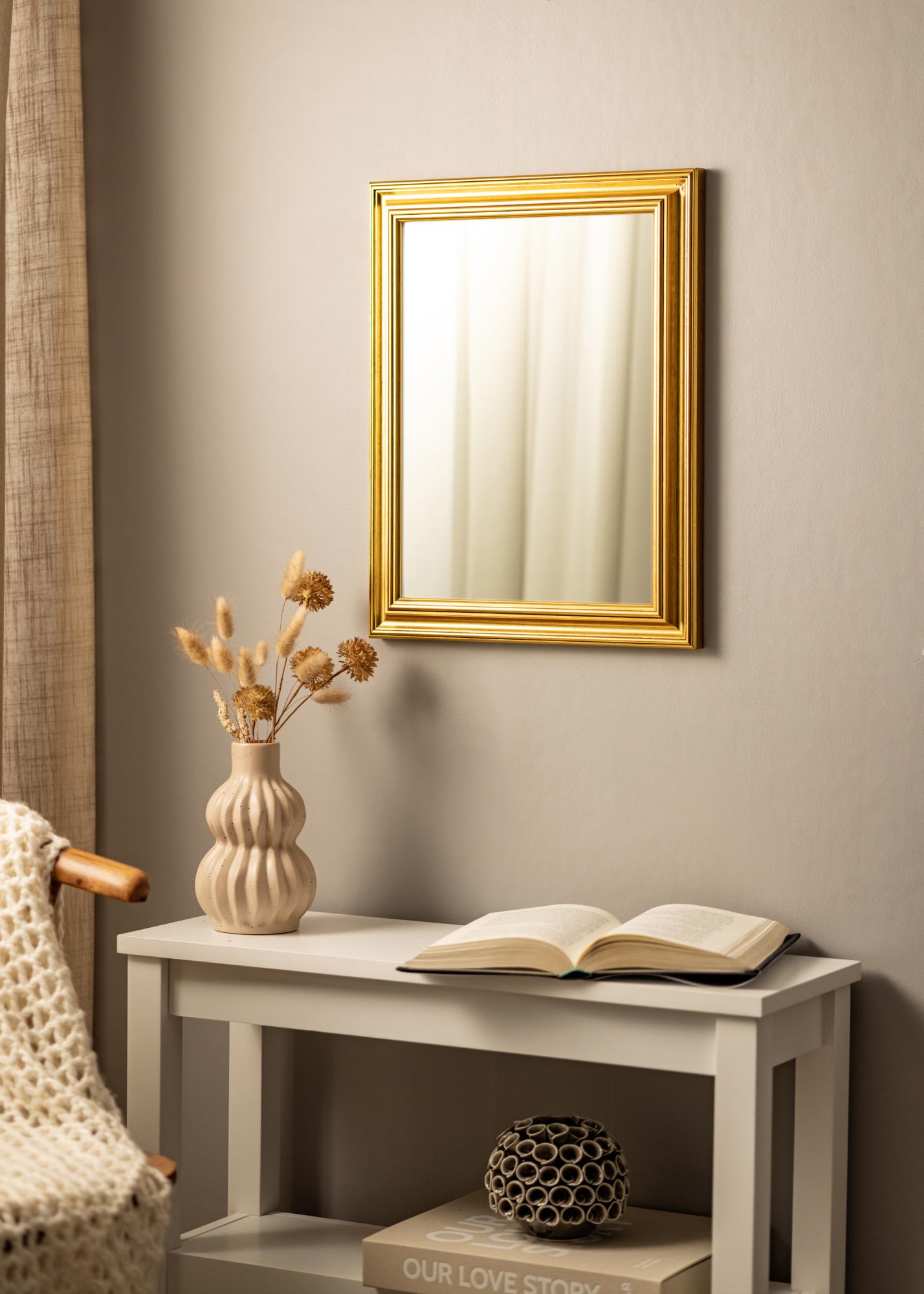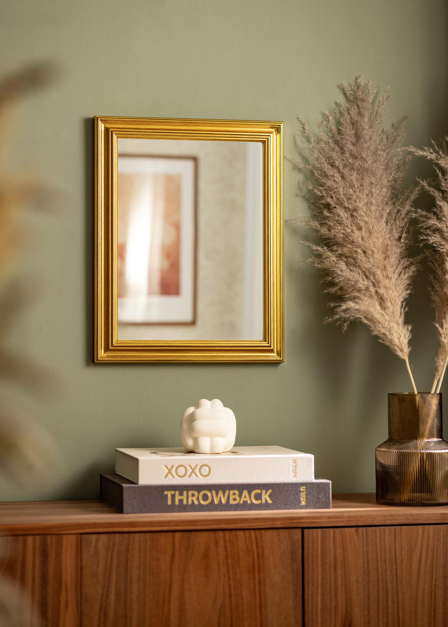 Klasszikus profilú arany színű tükör fa kerettel, amely kézzel festett hatást kelt, ez a tükörnek élő érzetet és szép fényt ad. A széles keretléc exkluzív megjelenést kölcsönöz a tükörnek, így az egyaránt jól illik antikvitásokkal berendezett otthonokba, valamint a modern otthonokba romantikus vagy elegáns berendezéssel. Kombinálja a tükröt néhány sárgaréz gyertyatartóval és arany keretű képekkel, hogy teljes hatást érjen el a szobában.