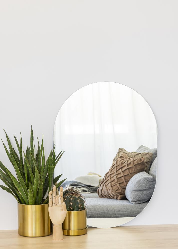 Szegély nélküli ovális alakú tükör. Tökéletes dekorációs elem a nappaliba vagy kisebb előszobai tükörként.