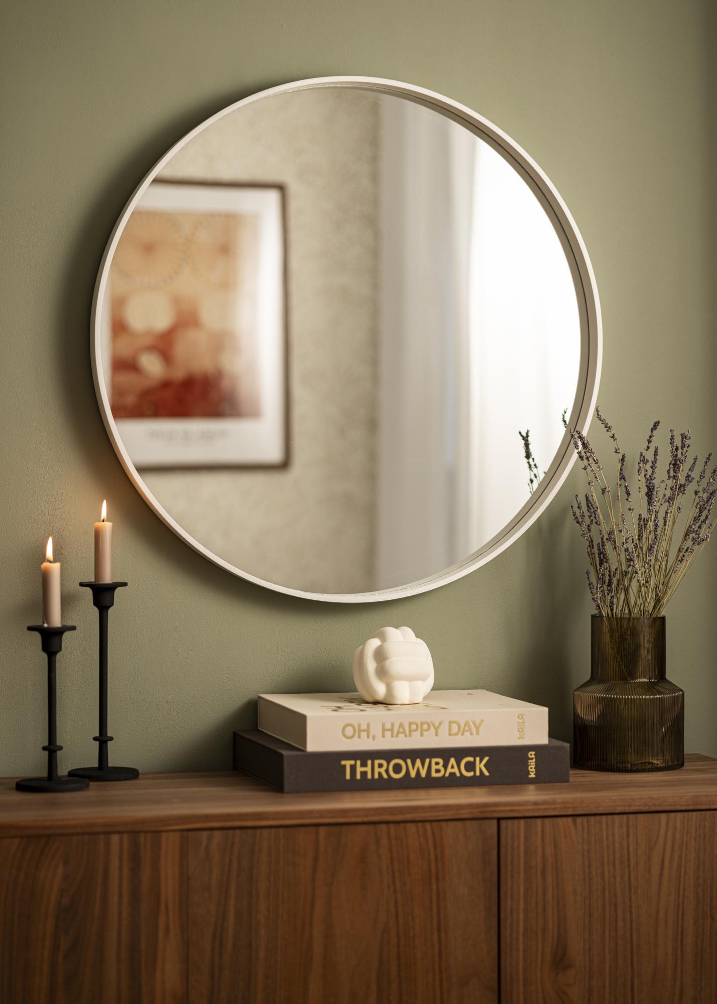Fedezze fel a kör alakú tükör elegáns egyszerűségét, amely otthonának időtlen dekorációjaként tökéletesen illeszkedik minden helyiségbe. A tükör körüli fehér keret világos és tiszta érintést kölcsönöz, amely kiegészíti a szobája összes színét és stílusát. Minimalista kialakítása miatt beleolvad a környezetébe, miközben megmarad a falon jellegzetes hangsúlypontként.