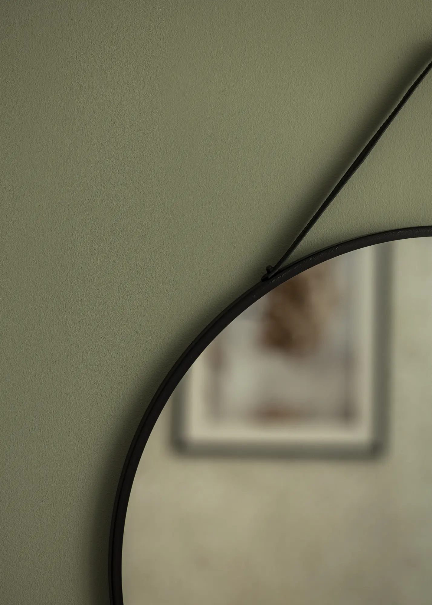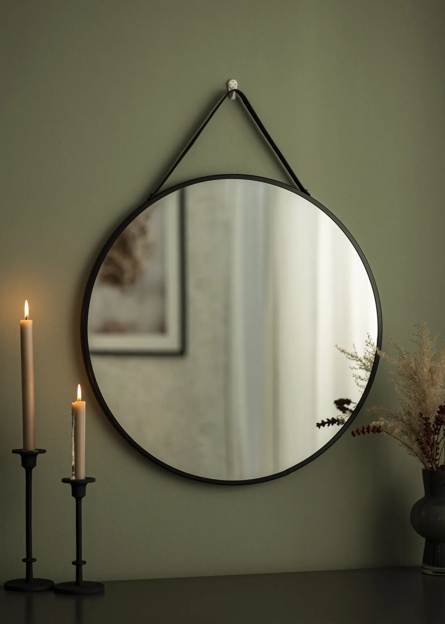 Trapani egy ízléses fali tükör, ami kicsit többet nyújt. A tükör kerek, és egy elegáns, fekete fémből készült keret veszi körül. A tükröt egy nagyon dekoratív műbőr szalaggal lehet a falra rögzíteni.