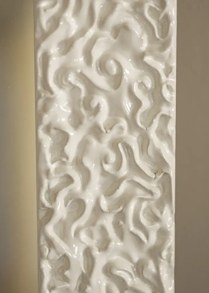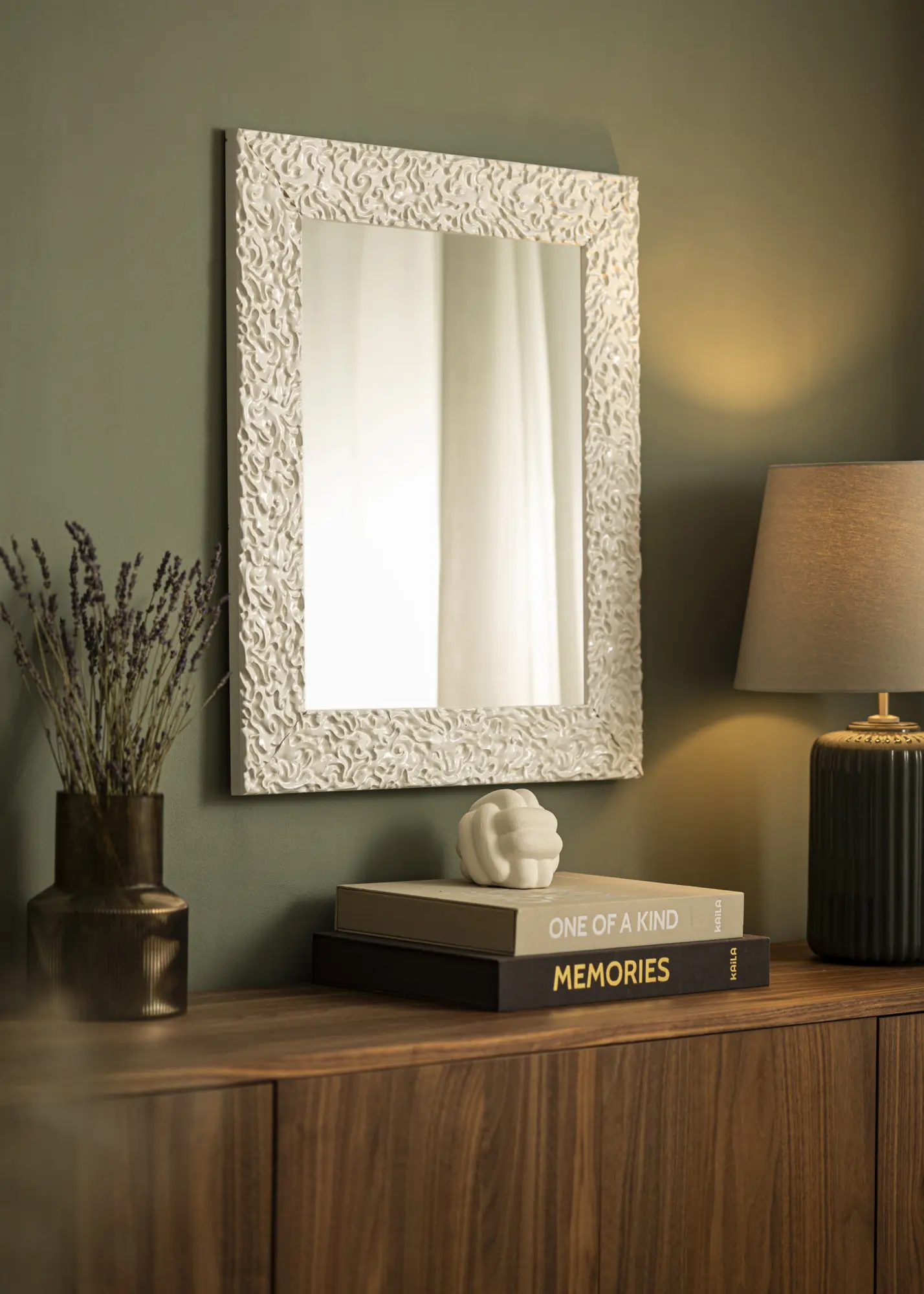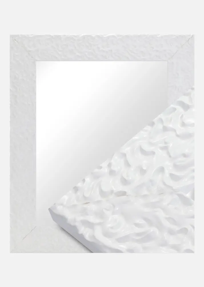A tükör magasfényű fehér felülete élénk, organikus mintával rendelkezik, amely modern és elegáns érzést kelt. Ez a fényes felület kiemeli a lágy, áramló formákat, és a keretnek exkluzív megjelenést kölcsönöz. Ez a tökéletes megoldás azoknak, akik klasszikus inspirációt keresnek kortárs dizájnnal kombinálva, figyelemfelkeltő részletekkel.
