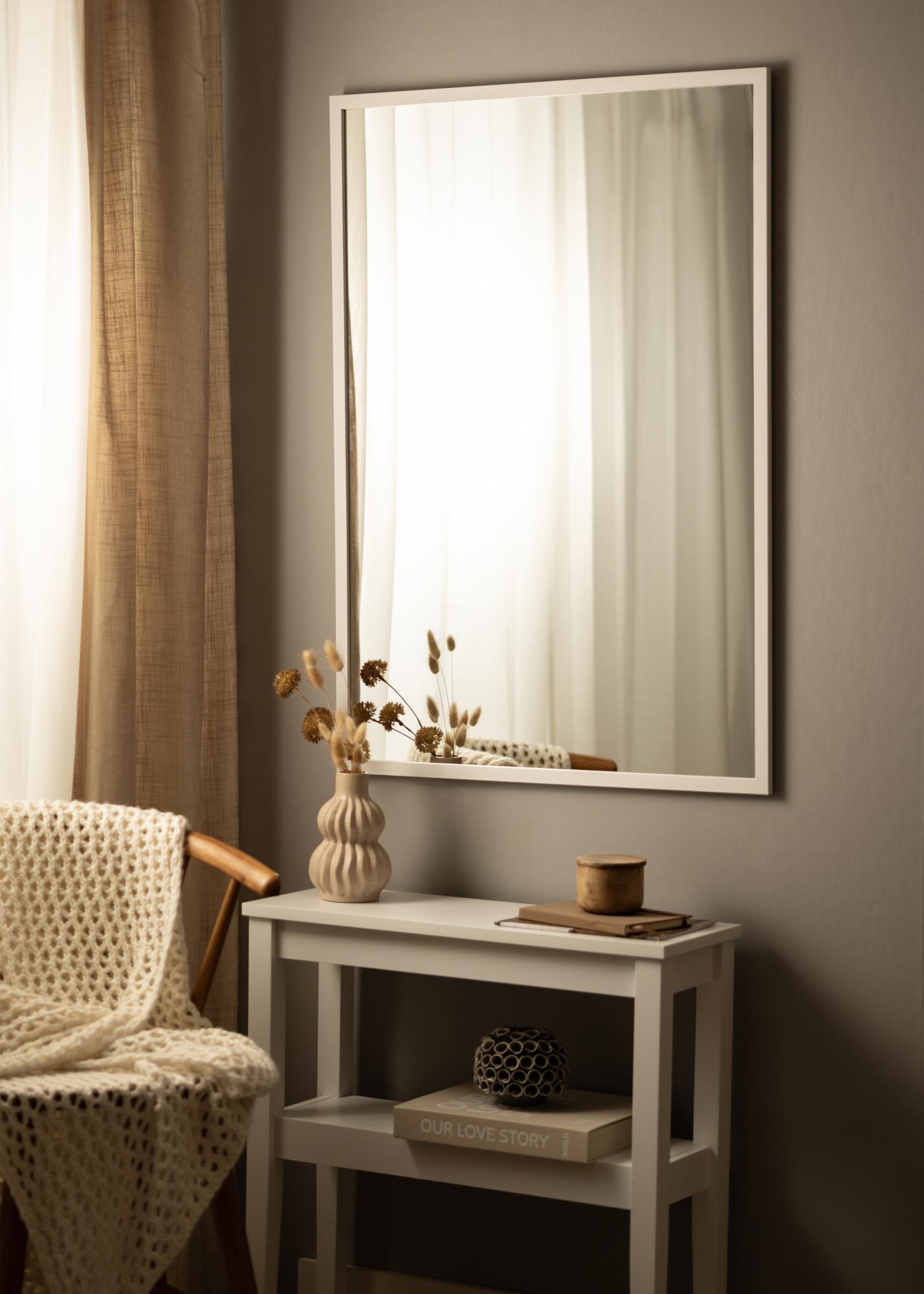 A tükör egy sor különböző kivitelű fali tükör része, amelyek közül ez egy 70x100 cm méretű változat fehér kerettel.