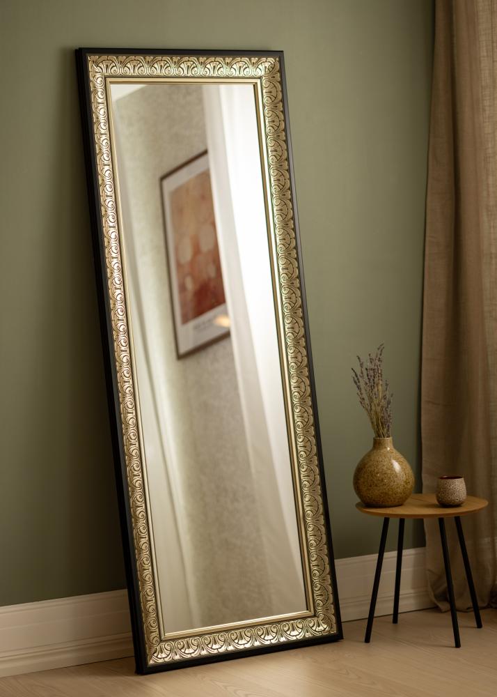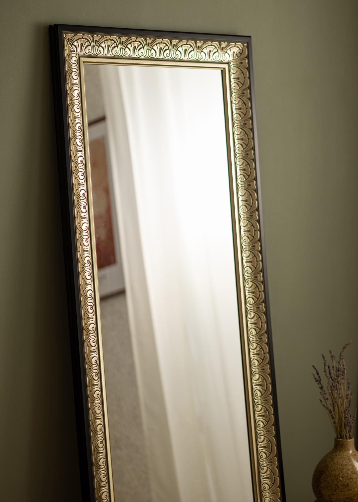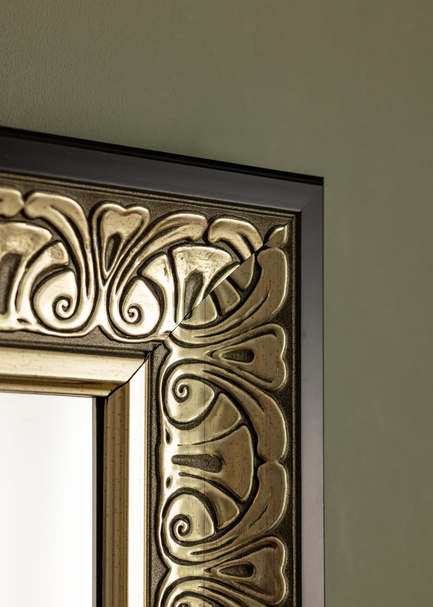 Stílusos ezüstszínű díszített tükör, amely ugyanúgy illik egy gardróbszobába, mint az előszobába vagy a fürdőszobába. A tükör körüli keret megjelenése az időtlen mintával lehetővé teszi, hogy a tükör mindenféle belső stílusba illeszkedjen, a romantikus pasztell színű nőies hálószobáktól az egyszerűbb és egyébként letisztult környezetekig, ahol a tükör kontrasztot teremt. Jól mutat egy komód vagy tálaló fölé akasztva is, hogy nagyobb térérzetet nyújtson a szobában.