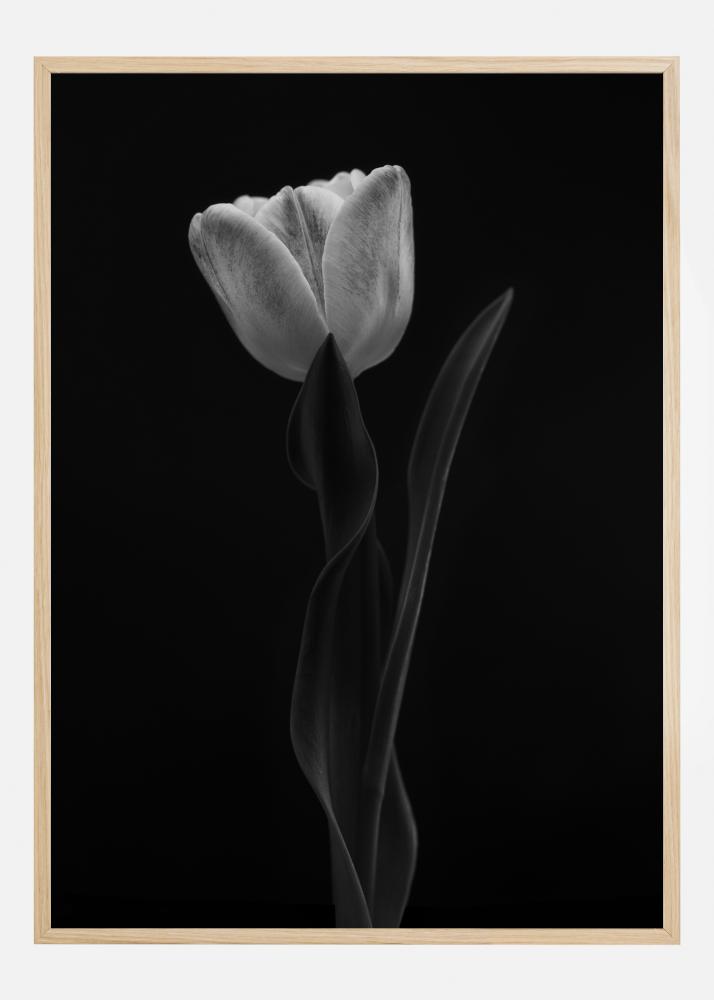 Egy egyszerű természetposzter egyetlen fehér tulipánnal fekete háttér előtt. Adj otthonodnak eleganciát, amikor ezt a nyomatot egy egyszínű falra akasztod, hogy a virág kiemelkedjen.