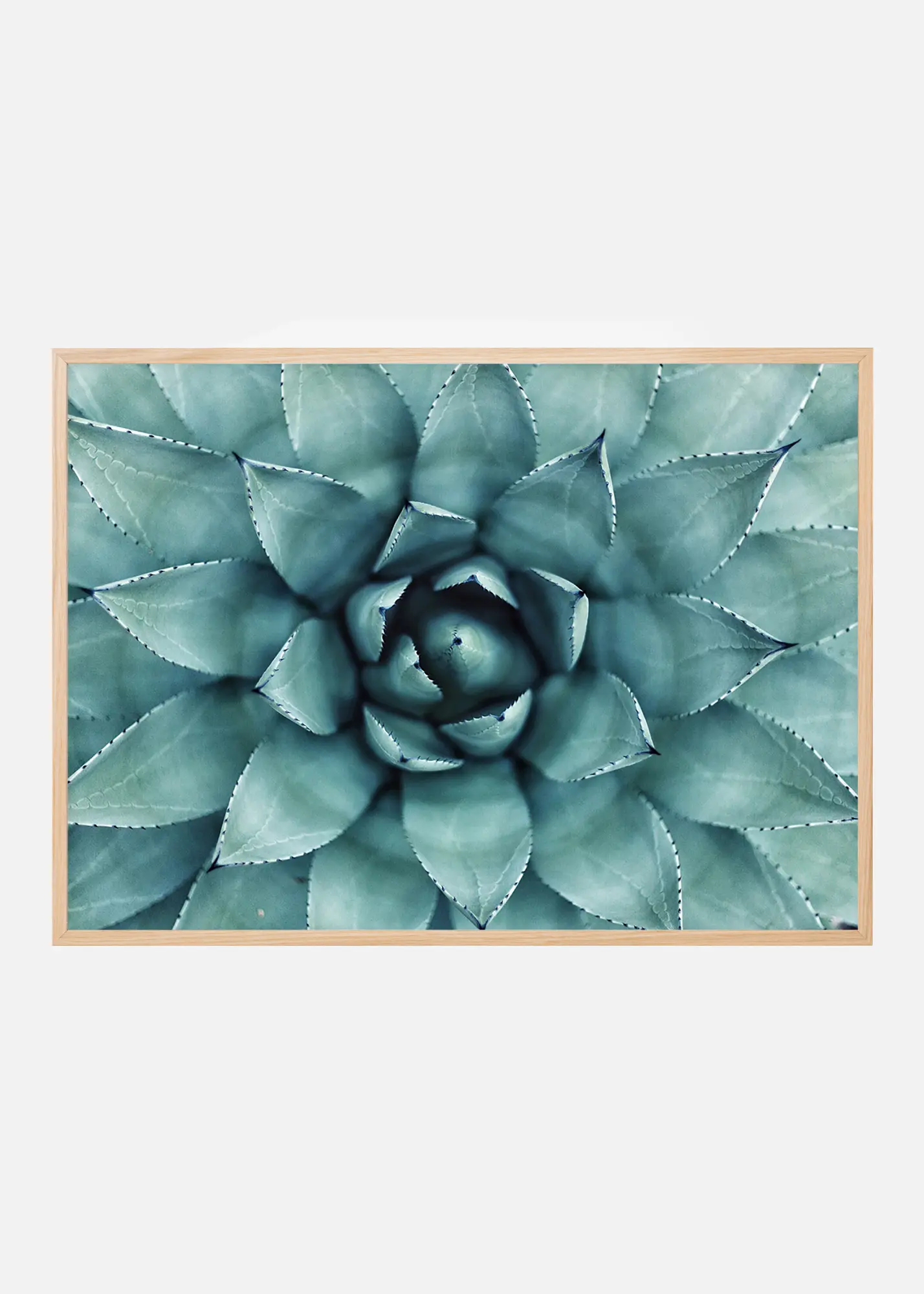 Grafikus poszter egy gyönyörű közeli képpel egy zöldeskék kaktuszról. A levelek markáns formája a sötét tüskékkel és a tompa türkiz szín vonzó mintát hoz létre, amely minden típusú belső térben jól mutat. Sötét képkeretben önmagában is jól mutat a falon, de része lehet egy növényekből álló kép kollázsnak is.