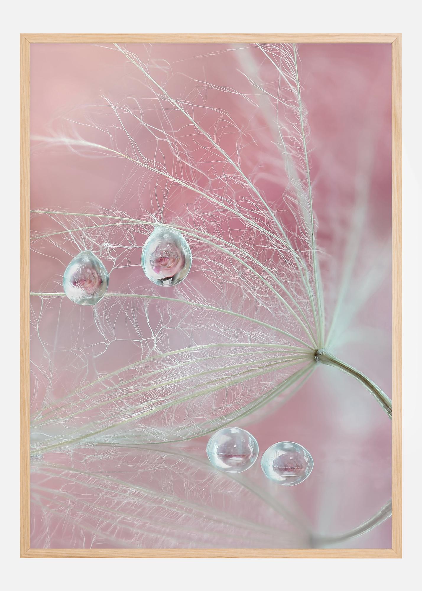 Elegáns poszter egy pókalakú virágfejjel, két vízcseppel a törékeny tollszerű végeken. Egy világos rózsaszín háttér világít át az egyes tökéletes vízcseppeken, miközben éppen a virágról való lepergés előtt lógnak. Élvezze a természet finom egyensúlyát.