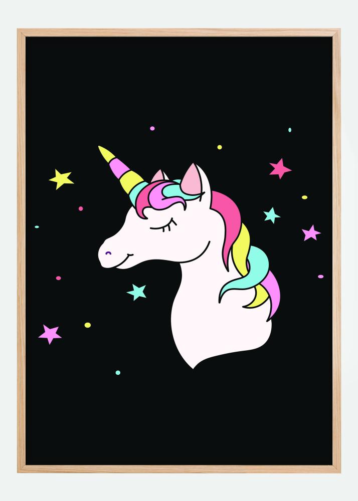 Egy aranyos poszter egy gyermeki fehér egyszarvúval fekete háttéren. Az egyszarvúnak rózsaszín, sárga és türkiz sörénye és szarva van. Ugyanazokban a színekben pompázó csillagok töltik meg a fekete hátteret, hogy egy szórakoztató hangulatot hozzanak létre, amely méltó egy hercegnőhöz. Akaszd fel ezt a gyerekszobában, hogy egy szórakoztató, különc képet kapj, amely ösztönzi a gyermekek fantáziáját.