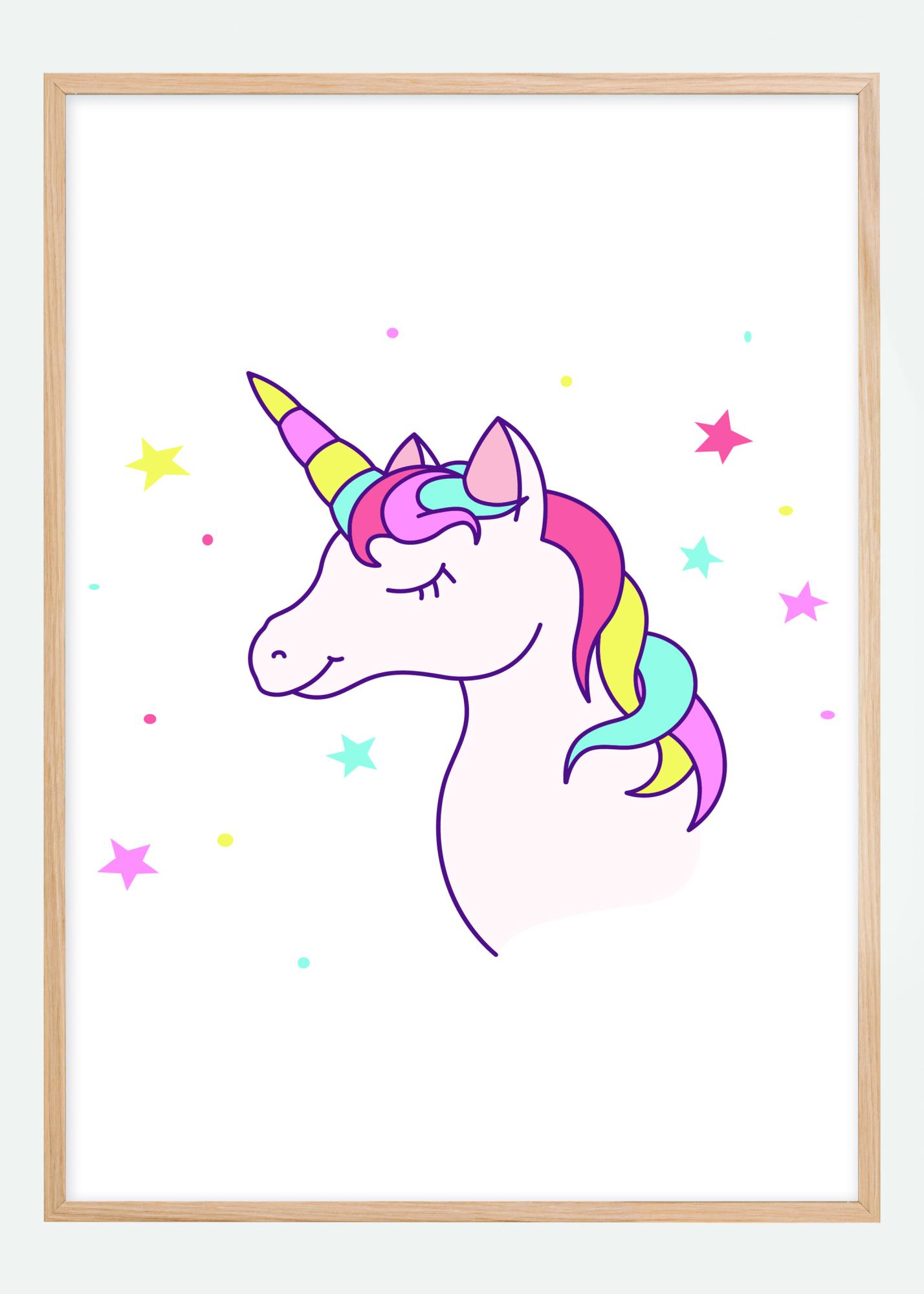 Egy ötletes poszter egy egyszarvúval, csukott szemekkel, fehér háttéren. Az egyszarvúnak sárga, kék és rózsaszín sörénye és szarva van. Ugyanilyen színű csillagok is vannak szétszórva mögötte, ami egy kedves, varázslatos képet alkot. Tökéletes a gyerekszobába, mivel egyszerű, szórakoztató rajz.