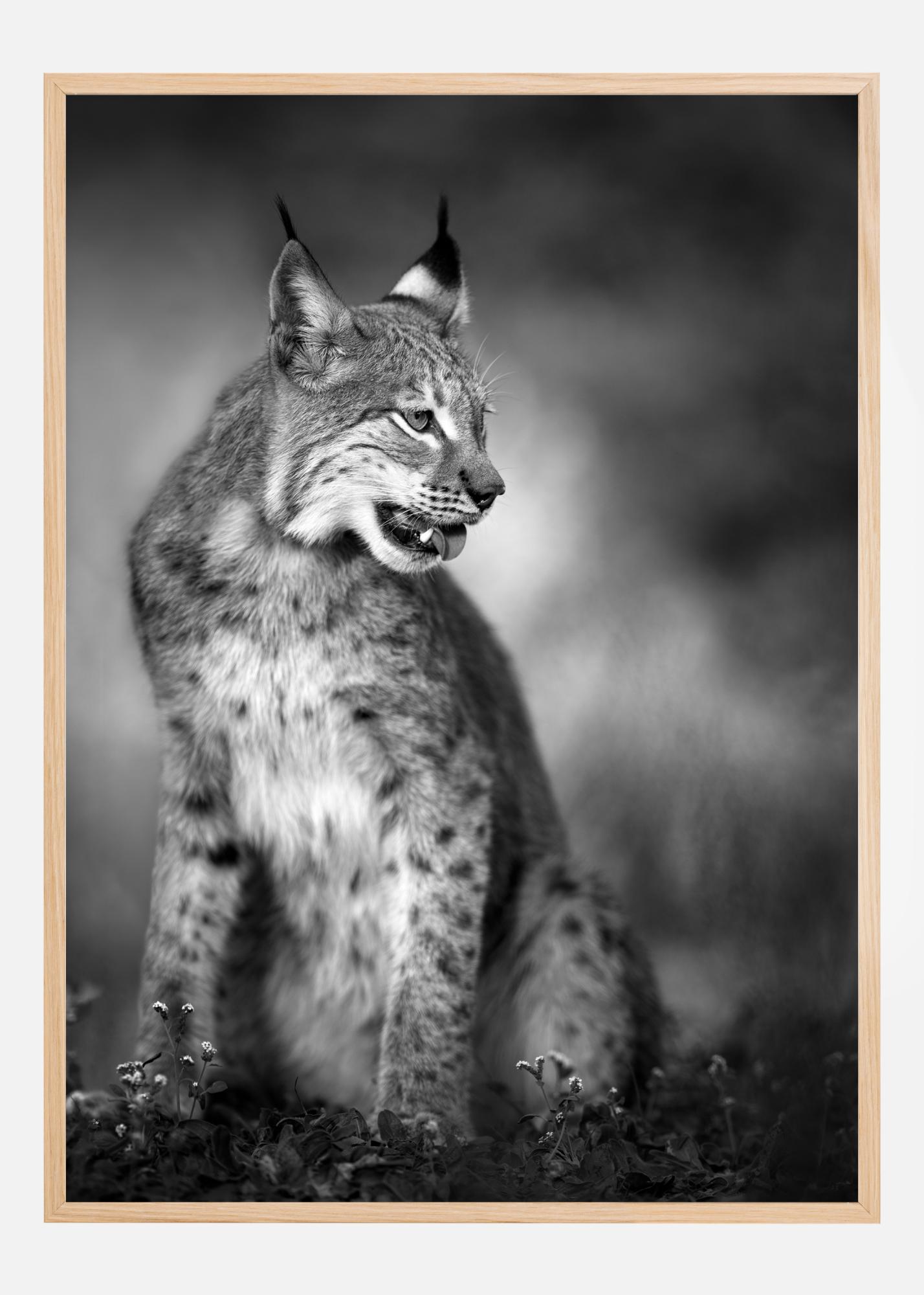 Egy állatvilág poszter, amelyen egy hiúz ül a fűben. A macska a kép jobb oldalára néz, és talán egy potenciális zsákmányra figyel. A szőr világos foltjai és a fülek bojtjai tiszta részletekben tűnnek ki. Akassza fel ezt a fekete-fehér nyomatot egy zöld falra a természetes érzés érdekében.
