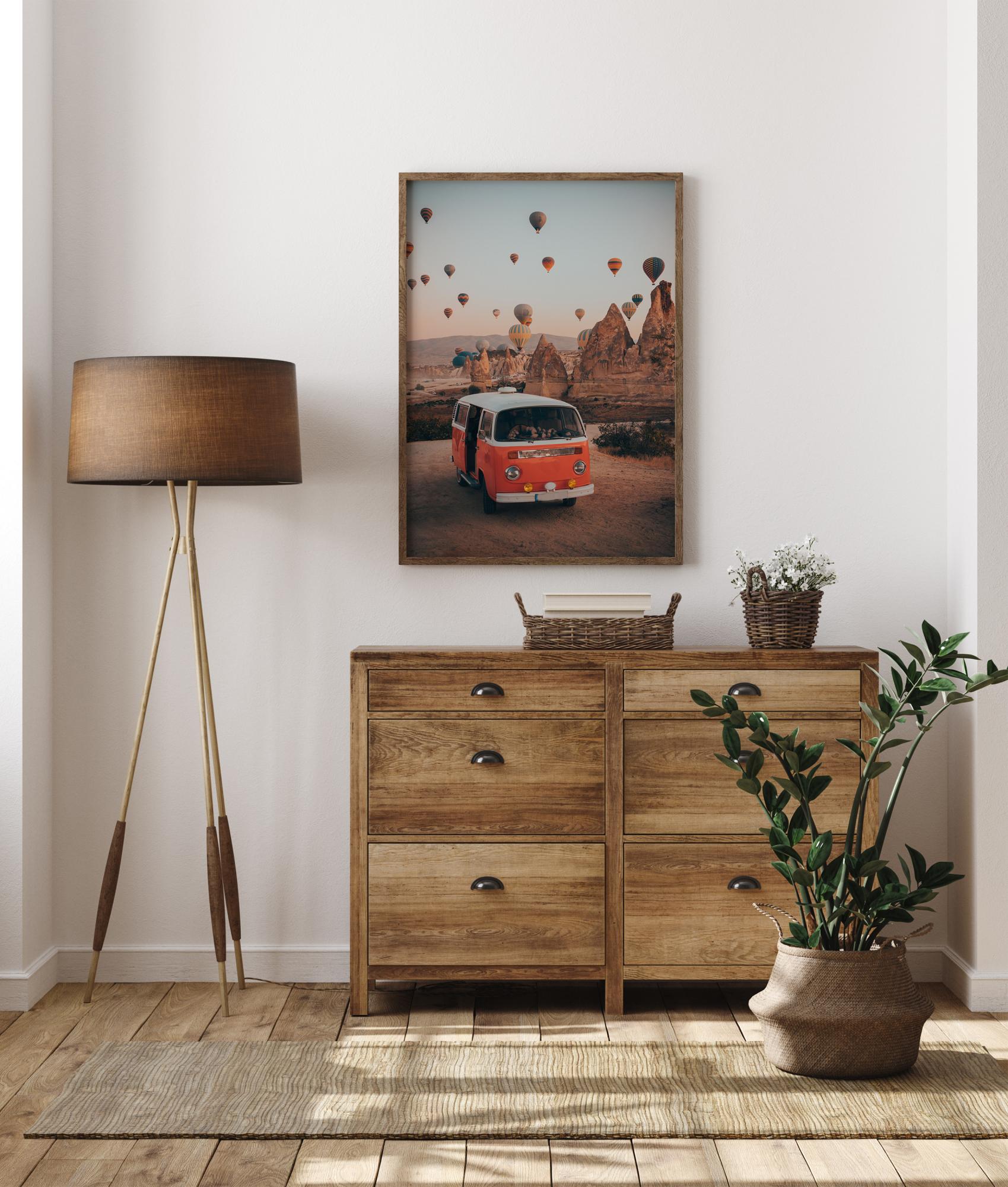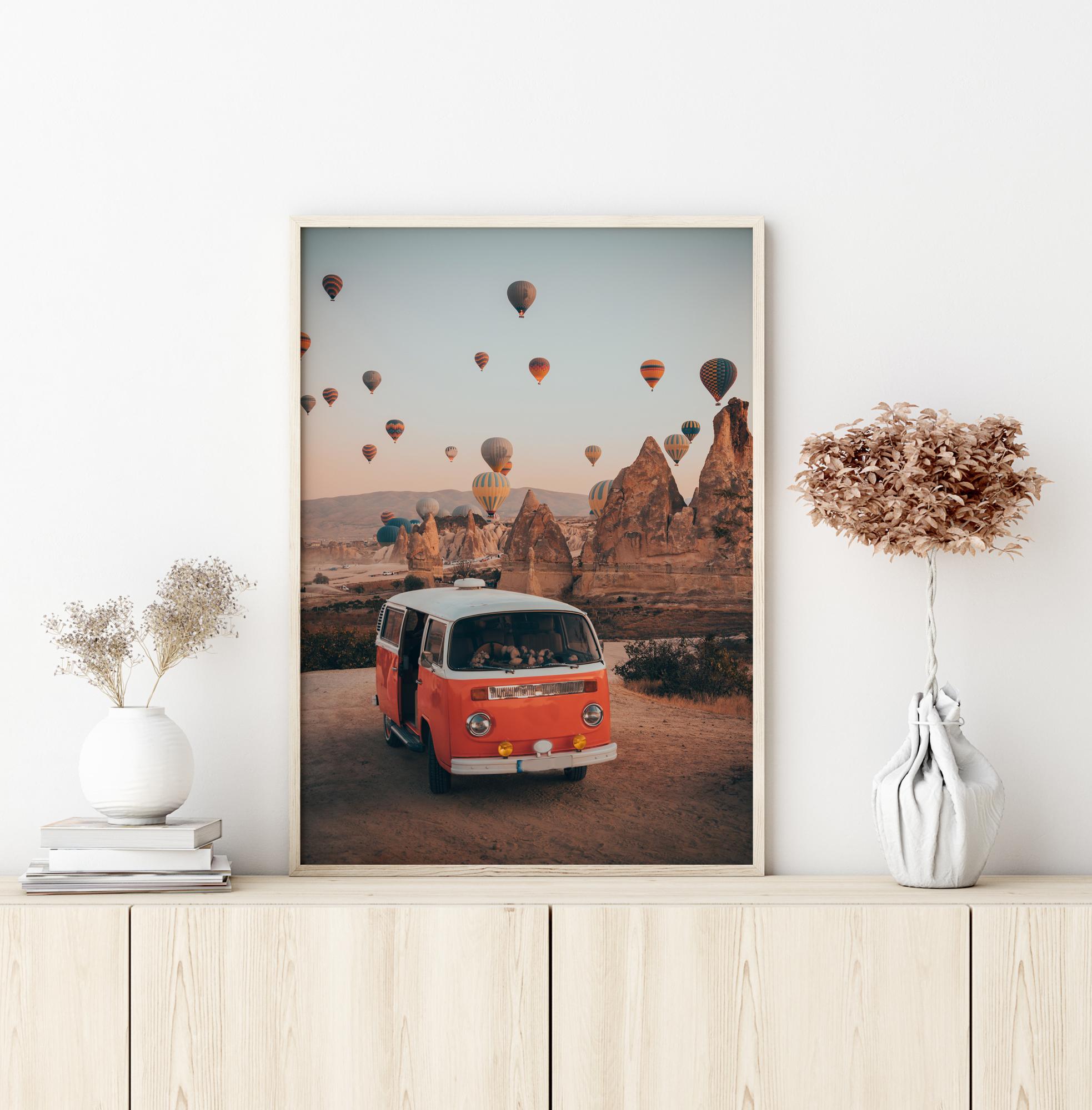 Egy tájposzter érdekes sziklaformációkkal és meleg levegős ballonokkal, amelyek a teteje felett repülnek. Egy narancssárga Volkswagen busz nyitott ajtóval áll az előtérben. A színes ballonok megtöltik az eget mögötte, ahogy felemelkednek a világoskék ég felé egy varázslatos utazásra.