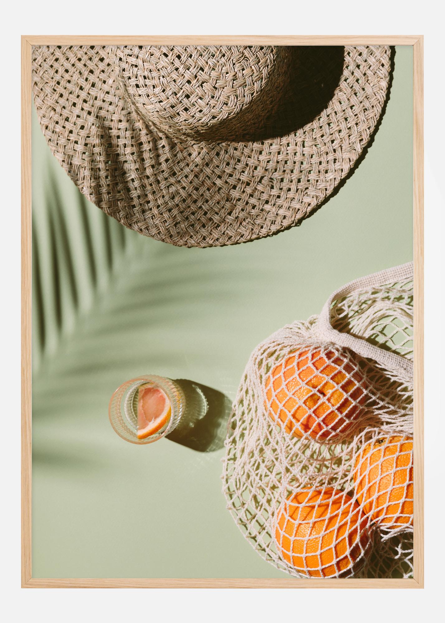 Ez a kellemes, nyári poszter a nyaralás hangulatának lényegét ragadja meg a laza és friss képi világával. Egy fonott szalmakalap és egy hálós táska, napsütötte narancsokkal megtöltve, megnyugtató zöld tónusú háttér előtt azonnal közvetíti a lustálkodó napok érzését a napon. A kép azonnal asszociál a meleg éghajlatra, a friss gyümölcsökre és a kikapcsolódás idejére. Kiváló választás mindazok számára, akik egy kis nyaralási hangulatot szeretnének behozni otthonukba vagy munkahelyükre.