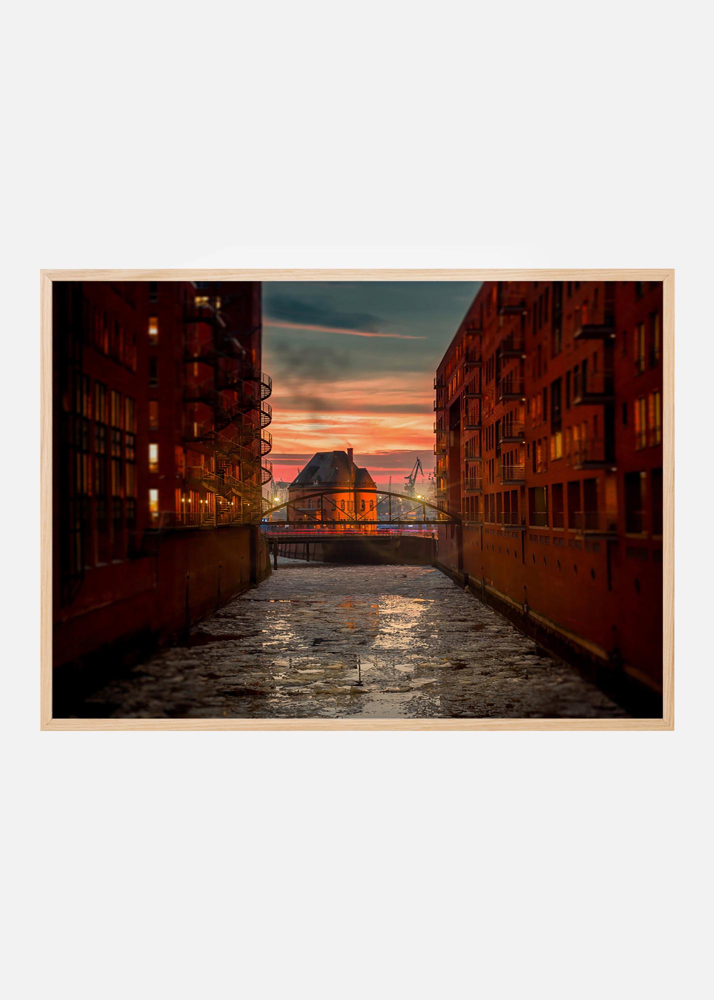 Naplemente az ódon raktárnegyed, a hamburgi Speicherstadt csatornáival és neogótikus téglából készült épületeivel. Az építészeti műemlékvédelmi területről készült fénykép jól illik az építészet vagy a történelem iránt érdeklődők otthonába. A poszter legjobban egy vékony fémkeretben mutat, amely illik a feszes építészethez, és más városképekkel együtt szépen mutat a falon.