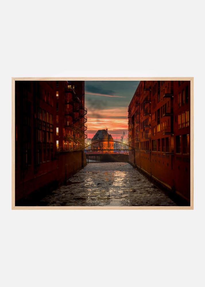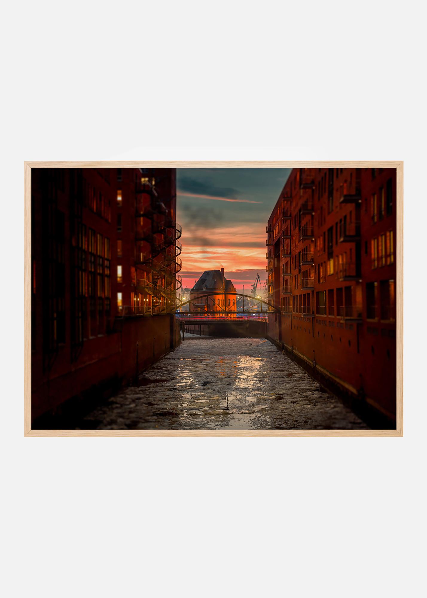 Naplemente a régi Hamburgi Speicherstadt raktári negyed felett csatornáival és neogótikus téglaházaival. A műemlékvédelmi területről készült fotó szépen illeszkedik az építészet- vagy történelemkedvelők otthonába. A poszter legjobban egy vékony fémkeretben mutat, amely illeszkedik a szigorú építészethez, és jól mutat a falon más városképekkel együtt.