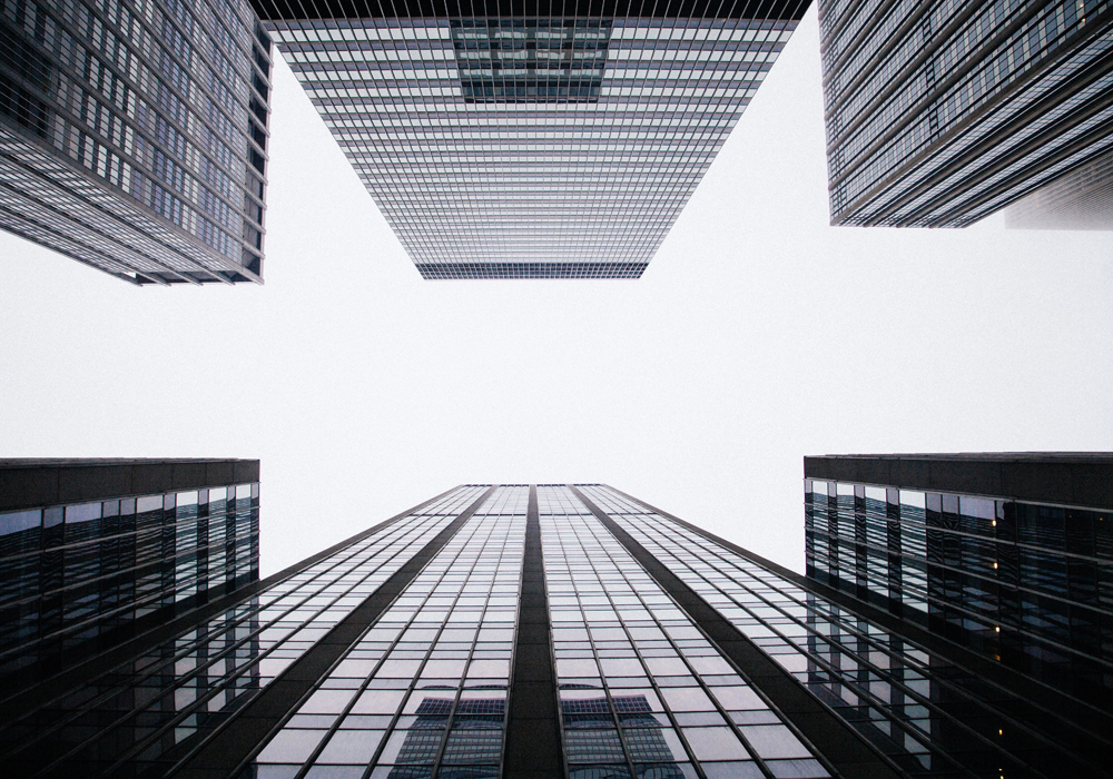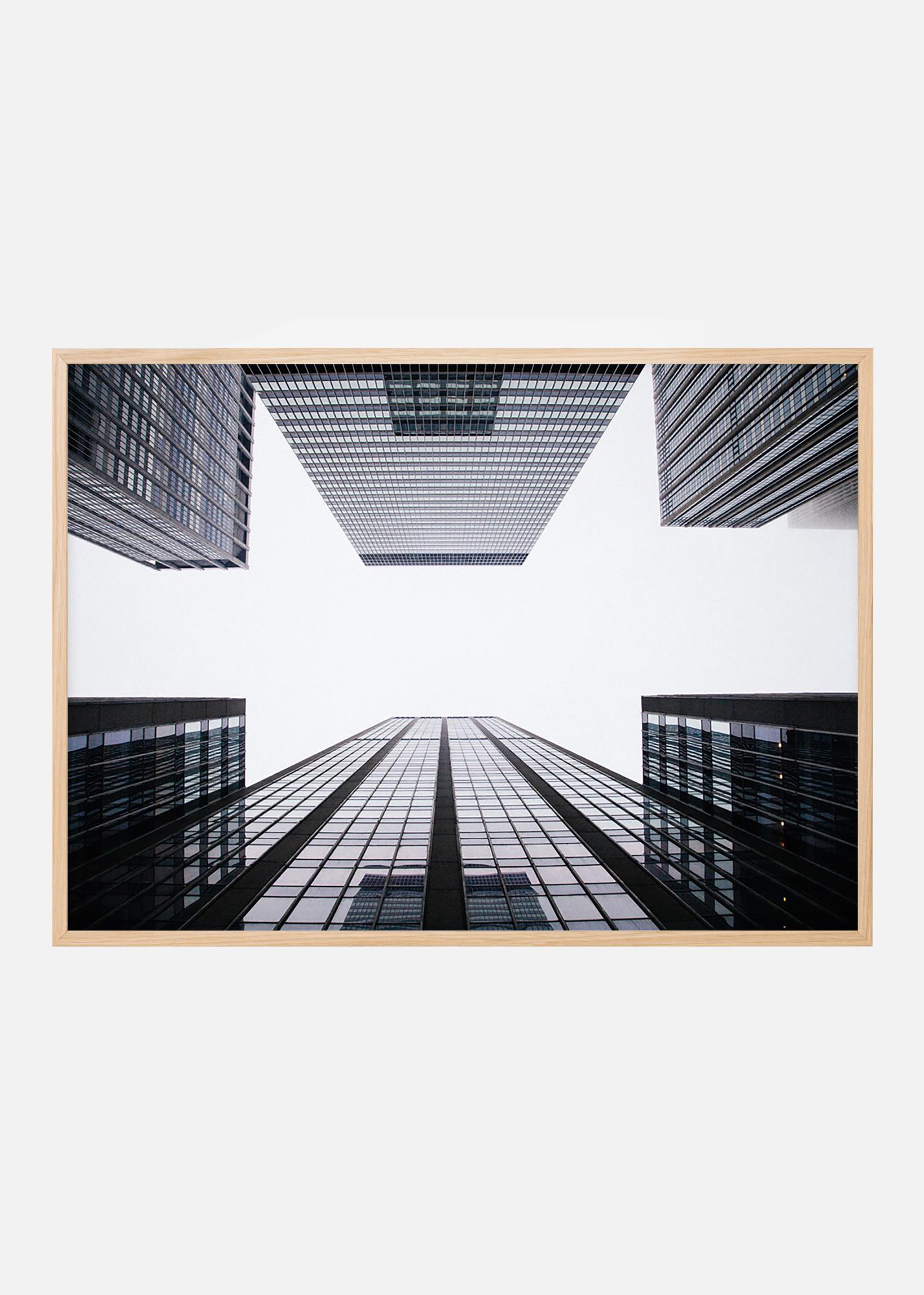 Építészeti poszter növekvő felhőkarcolókkal egy felhőfehér égbolt alatt. Minimalista kép sötét épületekkel fehér háttéren, az ég tükröződéseivel az üvegtáblákban. Tökéletes ajándék annak, aki szereti a grafikus épületportrékat. A nyomat jól mutat egy fekete keretben, amely erősíti a kép sötét részeit, és szép kombinációt alkot más építészeti fényképekkel.