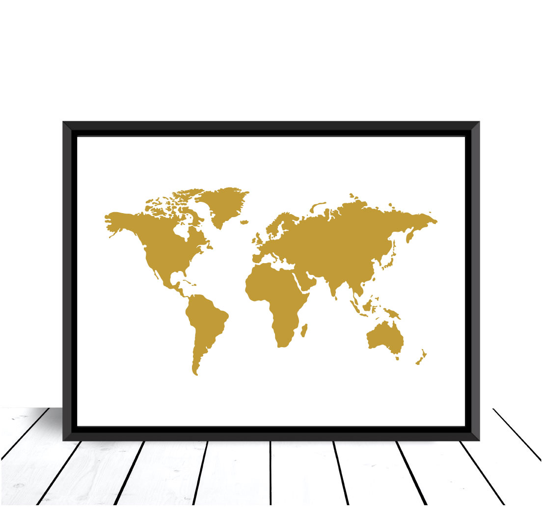 Grafikus nyomat a világpolgár vagy világjáró számára, aki szeretne dicsekedni. Egy egyszerű térképillusztráció stilizált világtérképpel arany színben fehér háttérrel. Ugyanolyan jól illik a lakás bármely szobájába. Helyezze el a posztert más, utazás témájú képekkel együtt, vagy használja arra, hogy megjelölje a világ minden részén meglátogatott helyeket.